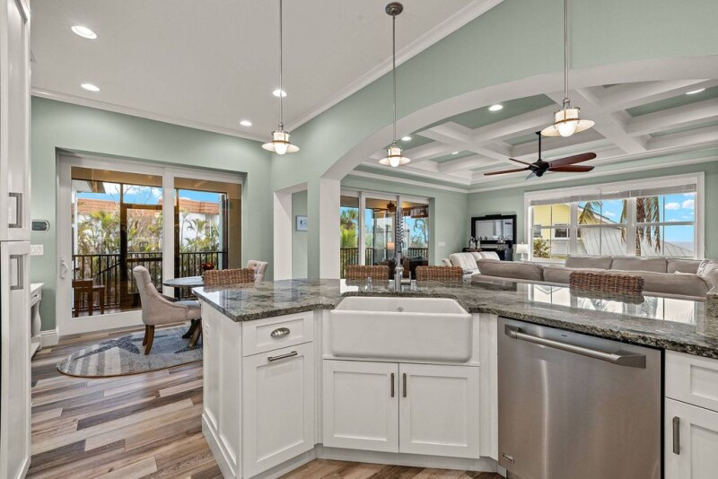 Your serenity by the sea can be found in this exquisite newly built home on Sanibel's charming east end, just one property from the beach. Top-of-the-line construction ideally blends with impeccable taste to offer this bastion of peace and tranquility. Elevated on concrete pilings not only gives you peace of mind but the coconut's eye view fills almost every impact-rated window with breathtaking views of the gulf and the twinkling lights down the west coast of Florida in the evenings. The interior offers a stunning combination of gorgeous textures and decorator finishes. The cozy dining room is surrounded by mullioned glass and water views where enjoying a meal is a heightened experience. The culinary enthusiast will bask in the kitchen featuring top-of-the-line finishes, high-end appliances and an amazing island with abundant seating. The living room is bathed in warm natural light, adorned with coffered ceilings, and surrounded by water views. A front and rear screened lanai are ideal for relaxing and enjoying the sounds of the surf rhythmically lapping the beach. The stunning backyard features a large pool and spa ideal for relaxing after a day in the sun.
