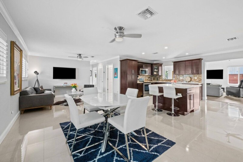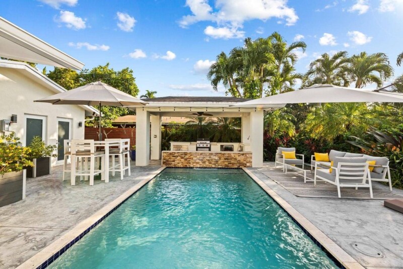 Discover this renovated Wilton Manors home situated on a beautifully landscaped, private corner lot of over 10,000 SF. The home features a circular drive, two car garage, impact windows and doors, solar panels and 2,199 SF of interior living space. The kitchen and baths have been fully modernized, and a split-bedroom floor plan offers two bedrooms with ensuite baths plus an additional bedroom and full bath. The spacious family room has 10 ft ceiling height with sliding doors to the backyard and pool. Outdoors you'll find an area designed for relaxation and entertainment with lush landscaping, an expansive patio/pool deck, in-ground pool, cabana bath and a covered summer kitchen to complete your own private retreat. This is the perfect home for enjoying a vibrant Wilton Manors lifestyle.