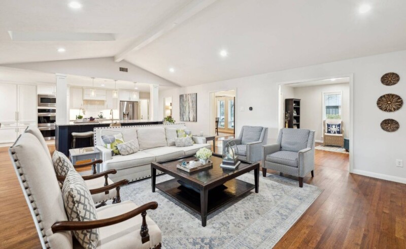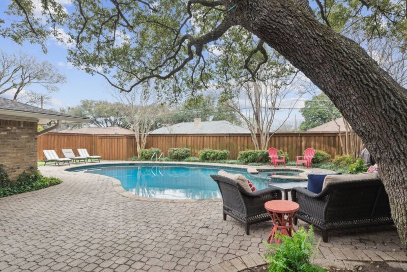 Gorgeous, renovated single story in Disney Streets with covered outdoor living & pool-spa! Walk into this fabulous 4-bedroom beauty with gleaming hardwood flooring & vaulted, beamed ceilings. Wonderful, open concept combines kitchen, family and cozy nook with floor to ceiling windows with view of the spacious yard, bringing the sunshine in! The renovated kitchen is a chef’s delight and features a 10 foot island-breakfast bar with granite counters, stainless appliances, double ovens & gas stove top. Formal dining off entry, office PLUS a huge game room with walls of built-ins & hidden indoor storage. Two spacious bedrooms share a Jack-and-Jill bath. Back yard has plenty of space for entertaining, swimming and sunbathing. Roof replaced in 2020, pool resurfaced in 2021. Steps to Cox Lane Park, Minutes to private schools, airports and downtown Dallas.