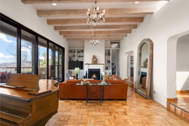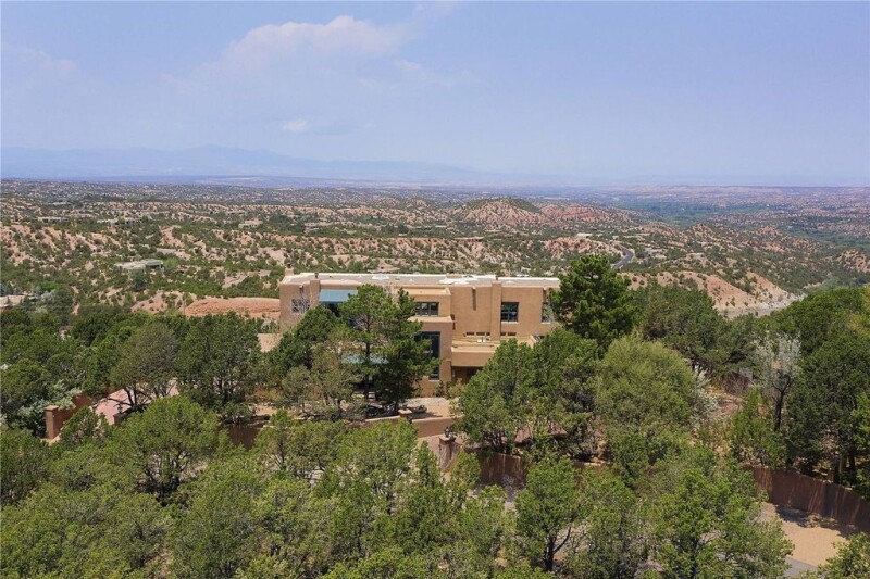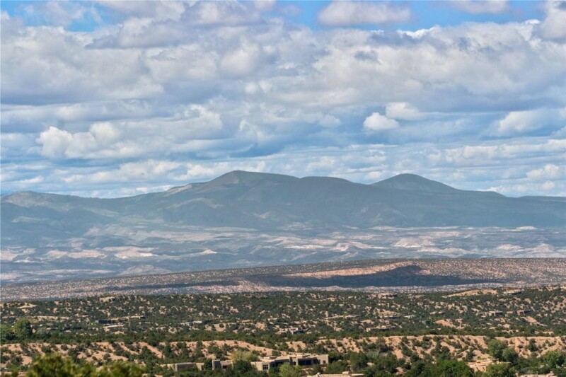 Situated at one of Santa Fe's most iconic addresses of Brownell Howland, just minutes from the historic Plaza, this property offers magnificent views that truly elevate the experience of living here. This 4 bedroom, 4 bath home on 3.89 acres offers panoramic 360-degree views, providing a stunning and serene backdrop. This gated estate immediately impresses with high wooded ceilings, 6 fireplaces, a classy lounge area with a wet bar flows effortlessly to an elegant living room with a classical fireplace, built-in shelving, and a wall of multi slide glass doors opening to a deck with views of Jemez Mountains, Tesuque Badlands in the north and San Antonio Mountain near the Colorado border. The gourmet kitchen features granite countertops, updated appliances, double ovens, ice maker, warming drawer, a corner kiva fireplace, and a large island. The kitchen also opens to the spacious deck, making indoor-outdoor dining and entertaining a breeze. The main level includes an owner's suite with a luxurious updated bath, soaking tub, a walk-in closet, a kiva fireplace, and access to the deck. The second downstairs bedroom has wood beams, a separate exterior entry door and a sitting area. Two spacious guest suites—one with a private deck and both with luxurious updated baths, kiva fireplaces, and walk-in closets—are located on the upper level along with an inviting, well-appointed media room. Ample parking is available on the brick lined entry way and an attached 2 car garage. Listing includes the adjacent lot (separate parcel number) at 157 Brownell Howland which has a shared well in place. Enjoy the convenience luxury living will taking in the views!.