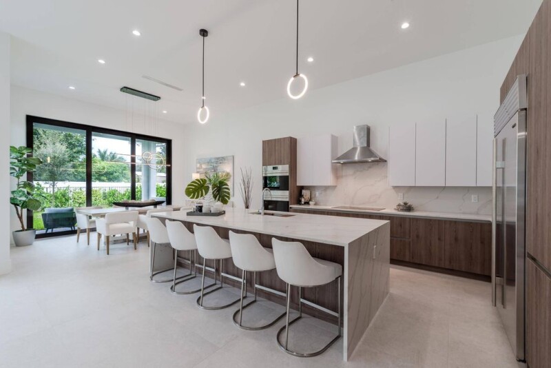 Welcome to modern luxury redefined. A true architectural masterpiece, this stunning 4 bed, 4 bath single story home spans 3,000 sq ft with impressive 12 ft ceilings, 3 car garage, and outstanding finishes. Showcasing massive porcelain tiles throughout the main living area and 10 ft floor to ceiling sliders, the home is bright and open with an atmosphere of elegance. The chef's kitchen features waterfall quartz countertops, tons of cabinet space, and top of the line Subzero & Wolf appliances. In the bedrooms you'll find wood floors, large walk in closets, and beautiful views of the backyard. The primary bathroom boasts 24 by 48 porcelain tile floors that extend up the walls and ceiling, seamless glass shower, and large soaking tub. Outside the patio is second to none, with.