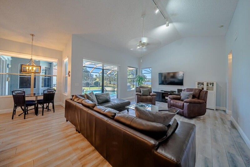Stunning POOL AND WATERFRONT Home in Legend Lake Estates! Welcome to this beautiful, SINGLE STORY home located in the desirable Legend Lake Estates. The 4 bedroom, 3 bathroom , 2.5 oversized garage residence offers a spacious 2,286 sq ft of living space, nestled on a generous .62-acre lot with breathtaking lake views. From its elevated ceilings to its modern amenities, this home provides both comfort and style. Upon entering, you'll be greeted by elevated ceilings, neutral paint tones and tile plank flooring throughout. The open floor plan includes a formal dining space, living room, and a cozy family room--perfect for both relaxation and entertaining. Ceiling fans and a central vacuum system add to the convenience.