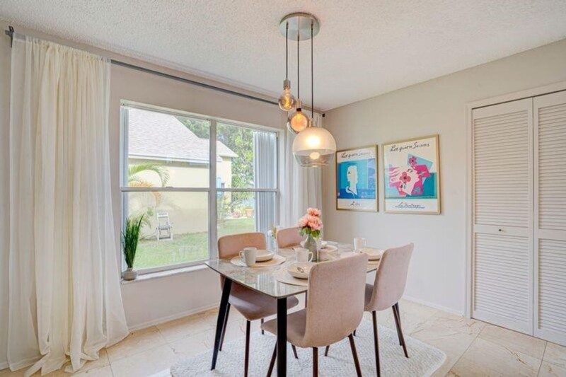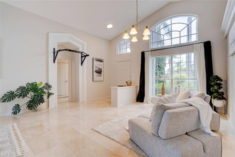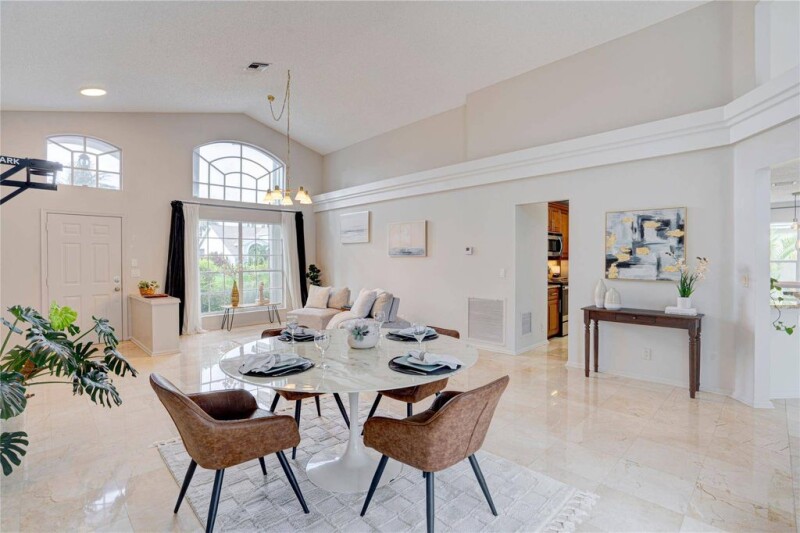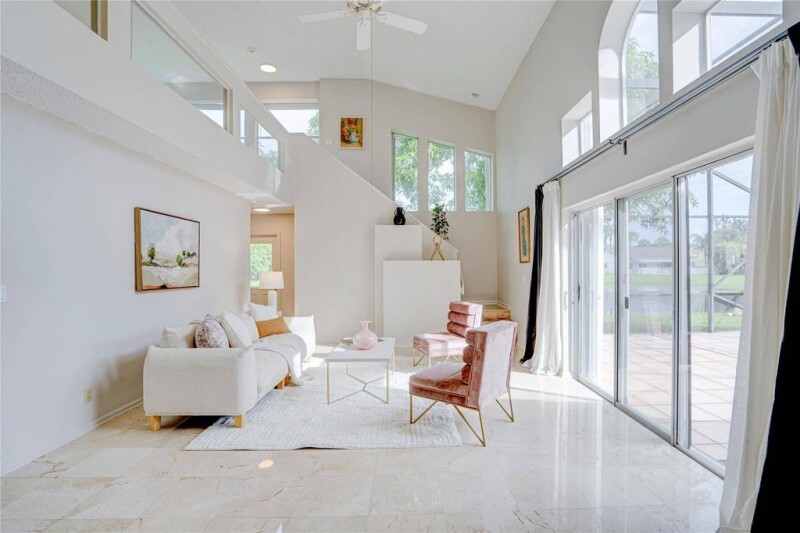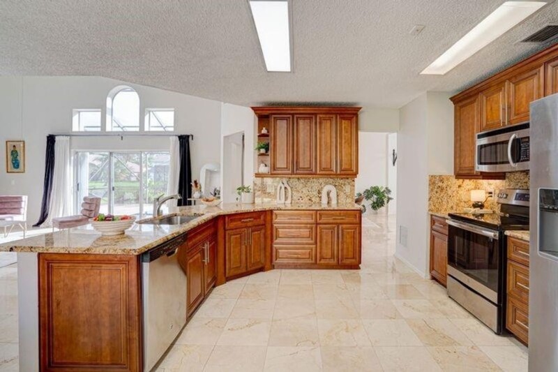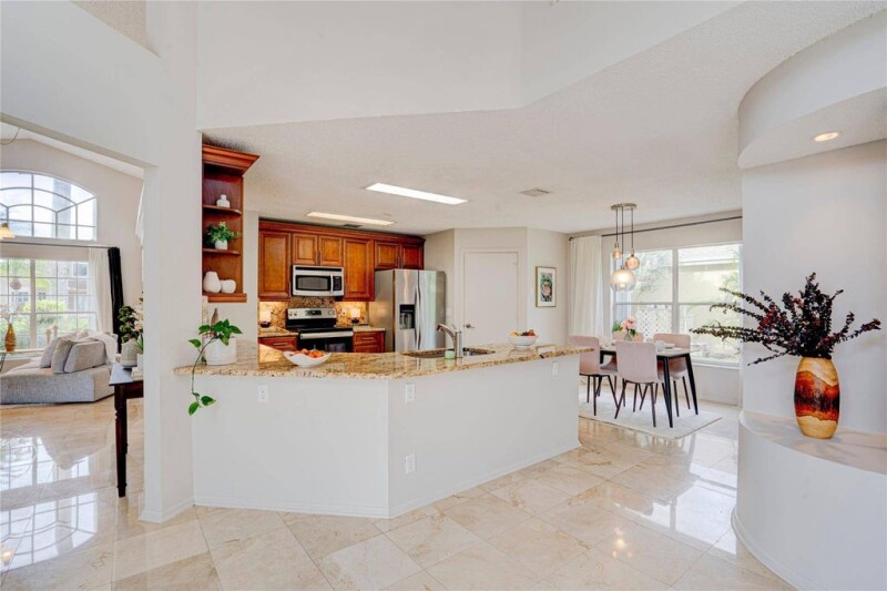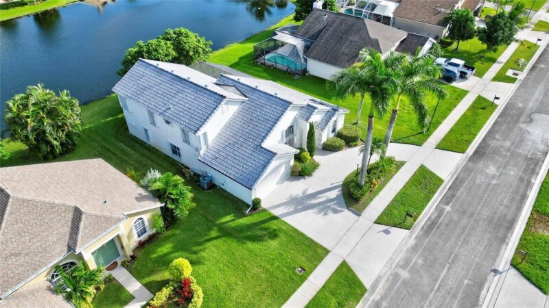 Unique 2-story WATERFRONT home boasting 4 beds, 3 baths, and the largest floor plan in the community. Split layout, open concept, flooded with natural light. Recent upgrades include a tile roof, AC (2020), guest bathroom and upscale marble flooring in the main area. Valuated ceilings, clerestory windows reveal stunning lake views. Kitchen features wooden cabinets, granite countertops, stainless steel appliances, and pantry. First floor: primary/guest bedrooms and 2 baths; second floor: 2 bedrooms with a jack-and-jill bath and a loft. Screened patio, room for a pool in the large backyard. Very beautiful landscaped backyard with mango trees and lake access for water activities. Ideal for those who appreciate comfort, nature, and privacy. Located in a top-rated school district. Low HOA fees.