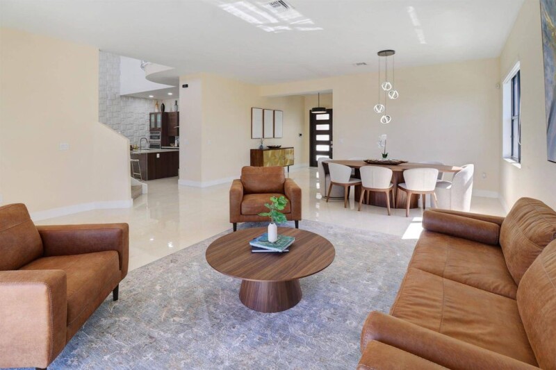Welcome to Serenity in West Kendall! This 3,045 sq/ft home with 5 bedrooms, 3.5 baths, and a 2-car garage sits on a corner lot. Inside, the double-height main living and kitchen areas exude grandeur, featuring a Crystal Chandelier and a stunning glass grand staircase. The kitchen boasts high-end amenities like Walnut laminate cabinets, Quartz Countertops, Stainless Steel Appliances, and a wine cooler. Enjoy porcelain floors on the first level and plush carpeting upstairs. Step outside to a pool area and outdoor kitchen, perfect for entertaining. The Serenity community includes a Zen Central Park, and hurricane shutters ensure safety. Make this dream home yours!.