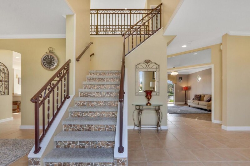 NEW ROOF INSTALLED MARCH 2019Welcome to this exquisite 5-bedroom, 3.5-bath home, perfectly situated in the coveted gated community of Lake Charles. Located on a quiet cul-de-sac, this stunning property offers a breathtaking lake view and sits on an over-sized third-of-an-acre lot surrounded by lush palm trees, creating a tropical paradise ambiance. With easy access to shopping, dining, Mets Spring Training, and I-95, this home combines convenience with serene luxury. Upon entering, you'll be captivated by the grand wrought iron spiral staircase, featuring two-way access, which leads to the second floor. Upstairs, the spacious primary en-suite bedroom boasts a spa-like bathroom complete with a walk-in shower, a separate soaking tub, and abundant closet and storage space. Step out onto.