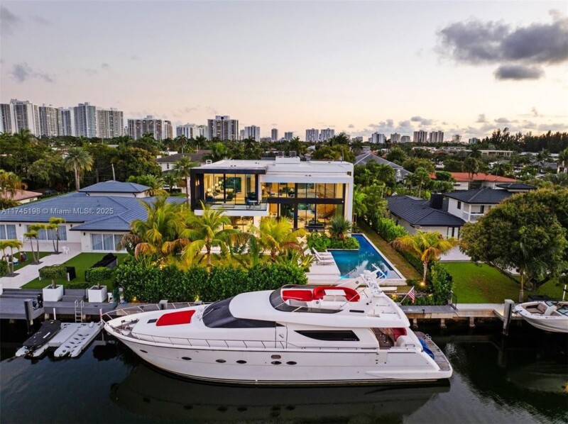 Your brand-new tropical modern home awaits in Golden Isles. Designed by SDH Studio Architecture + Design and built by TREO Construction, this nearly 7,000 sq. ft. masterpiece on a 12,750 sq. ft. lot offers soaring ceilings, five spacious bedrooms, an office, and service quarters. The top-of-the-line Italian kitchen is a true showpiece, complemented by a well-equipped wine cellar. The expansive backyard features a lap pool, jacuzzi, and a covered terrace, perfect for entertaining. With 85 feet of private waterfront, this home is fully equipped for boating and water toys, offering breathtaking views. Ideally located in a prime position, just a short walk from the main entrance and parks, this residence embodies luxury waterfront living at its finest—a true oasis of elegance and comfort.