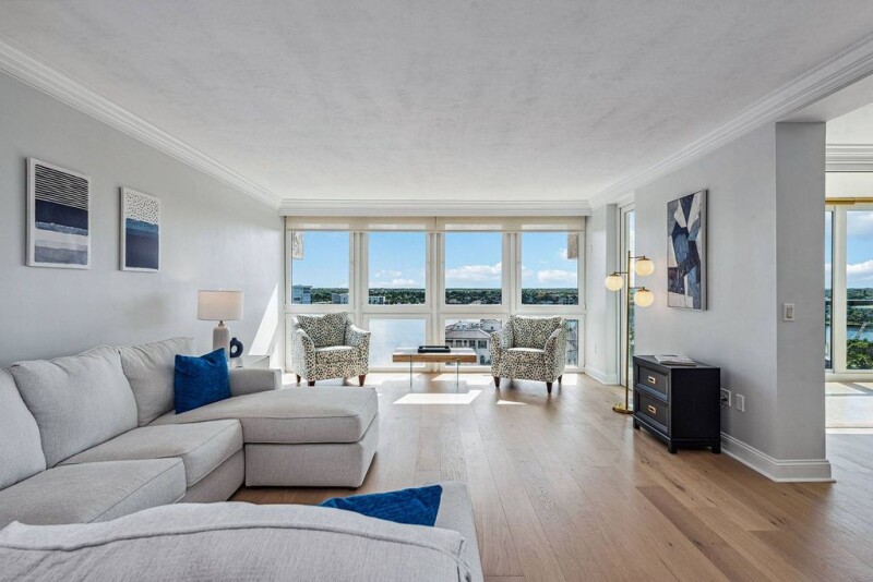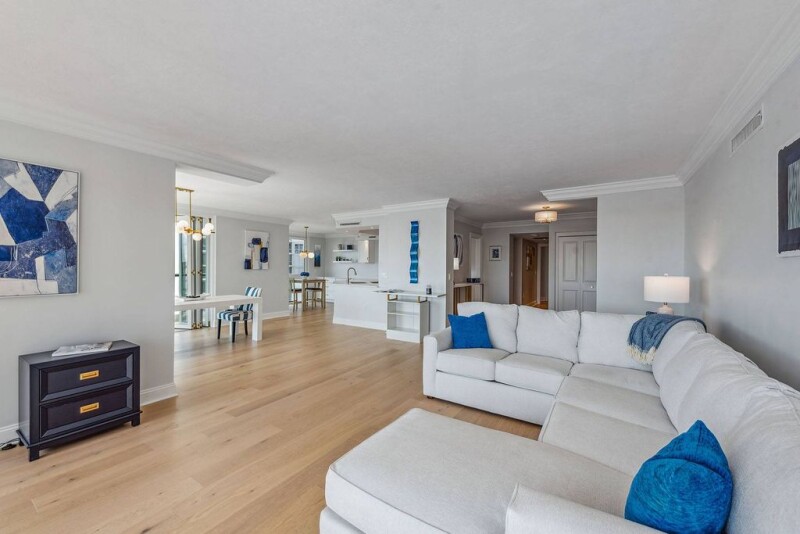 On the ninth floor of the Allegro in the prestigious Park Shore neighborhood of Naples, this stunning beachfront residence offers panoramic water views of the beach, Gulf of Mexico, Venetian Bay and captivating city views from every window. It's the ideal floor height to enjoy the impressive views from the moment you enter the door. Extensively renovated, the open-concept floor plan luxury condominium is filled with natural light from floor-to-ceiling impact windows and sliders. The beautifully transformed lanai has been converted into a Florida room with glass sliders, allowing for year-round enjoyment of the breathtaking scenery and an extended living space. This elegant two-bedroom, two-bath high-quality home boasts crown molding, wood flooring and high-end furnishings. The gourmet kitchen is a standout, featuring tray ceilings, recessed lighting, white shaker-style cabinets with soft-close drawers and gold hardware. With ample storage, quartz countertops and a stunning backsplash, the kitchen offers city and water views and is equipped with premium Bosch stainless steel appliances, including a range, microwave, paneled French door refrigerator and paneled dishwasher. The open dining and living areas seamlessly flow into the Florida room, where expansive glass sliders frame the exceptional views. The owner's suite provides the ideal retreat with gorgeous views, a walk-in closet with custom cabinetry, and an en-suite bath featuring dual vanities, quartz countertops and a frameless glass walk-in shower tiled from floor to ceiling. The guest bedroom also offers impressive city views and has an en-suite bath with a white vanity, quartz countertop and frameless walk-in shower. The laundry room, complete with white cabinets, a utility sink with a granite countertop, a drying rack and Bosch washer and dryer, add extra convenience to this beautifully appointed home. The unit also comes with extra storage, providing ample room for all your belongings. Allegro's exceptional amenities include a beachfront heated pool and spa, barbecue area, fire pits, fitness center, social room with a full kitchen, craft room, conference room, kayak storage and 24-hour front desk service. The building also offers two guest suites for visiting family or friends, along with bike storage and private beach access. Ideally near the upscale shopping and dining of Venetian Village, Allegro has recently completed a multi-million-dollar renovation of its lobby, atrium and common areas. In the heart of Park Shore, you are close to upscale boutiques and dining at Venetian Village, offering an unmatched lifestyle in a premier Naples location. Just a short drive to the popular shops and dining of Old Naples and Mercato, Waterside Shops, executive airport, yacht clubs and marinas, museums, parks, art galleries, kayaking and paddle boarding, tennis and pickleball, golf courses, and all popular Southwest Florida amenities and attractions.