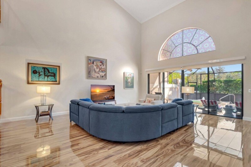 This stunning, fully renovated townhome offers 3,900 sq. ft. of luxurious living space with 4 bedrooms plus a family room, 5 full baths, and a loft. Beautifully designed courtyard entrance features new pavers, while the screened-in heated pool with a Jacuzzi offers a private retreat. Inside, the spacious living room boasts soaring two-story ceilings, a formal dining room, and an expansive loft. Open kitchen showcases white cabinets, quartz countertops, stainless steel appliances, and bar seating. Wood-look tile flows through the downstairs, while sleek laminate finishes the upstairs. Master suite has two custom-built walk-in closets, and each bedroom includes ensuite baths. A private fourth bedroom off the deck features a separate courtyard entrance, perfect for guests or home office.