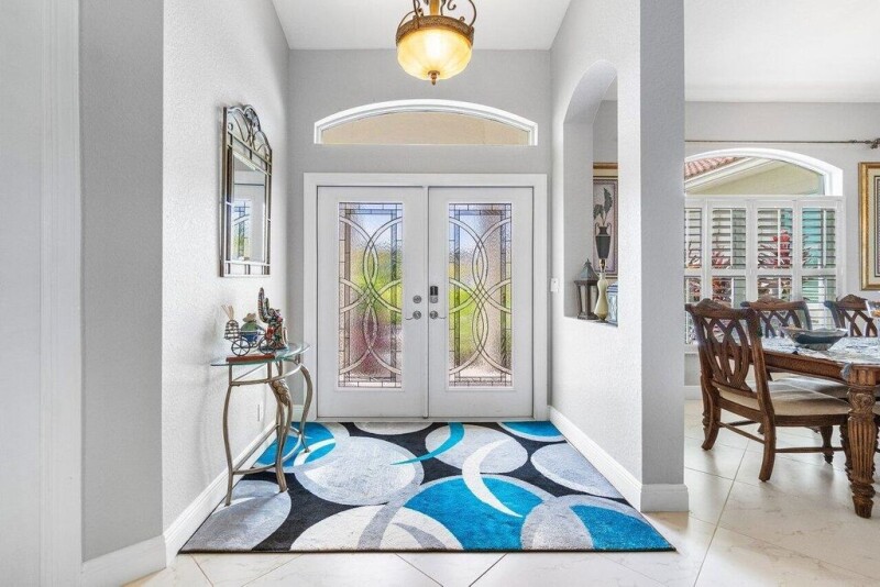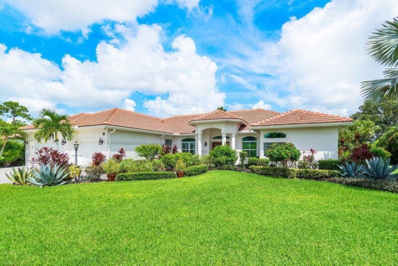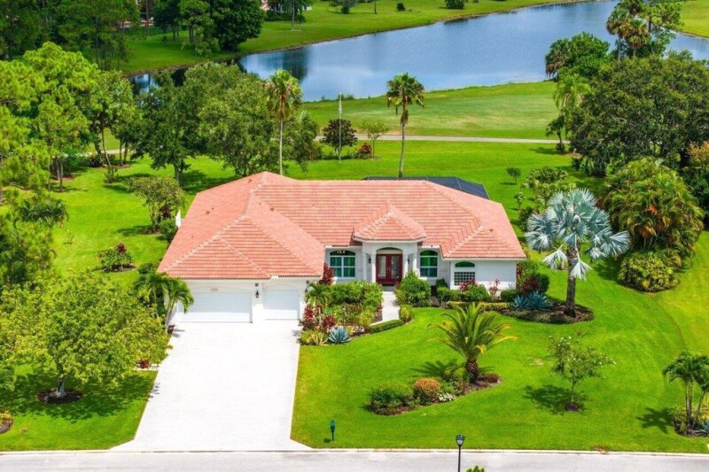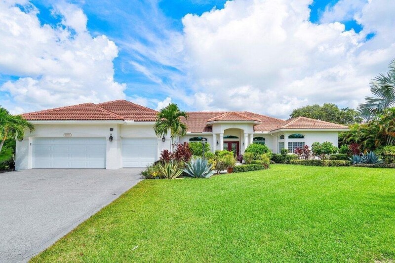 Fabulous move-in ready 5 BR + office, 4.5 BA home with pool on a stunning 1 acre lot in Bayhill Estates. This one story home offers 3,600 SF of living space with a split floor-plan and magnificent views of the18th hole of the PGA Estate Course and a sparkling lake. Generously sized rooms and 24'' porcelain tile give the home a modern feel. The updated kitchen opens to the family room and breakfast area, all overlooking the tranquil lanai and golf course. Large primary suite with 2 walk-in closets and luxurious renovated bathroom. All other bathrooms have been renovated as well. The outdoor living is just as stunning as the interior with a pool with lanai that was replaced in 2015, lush landscaping and lighting and plenty of yard space beyond.