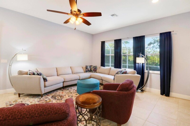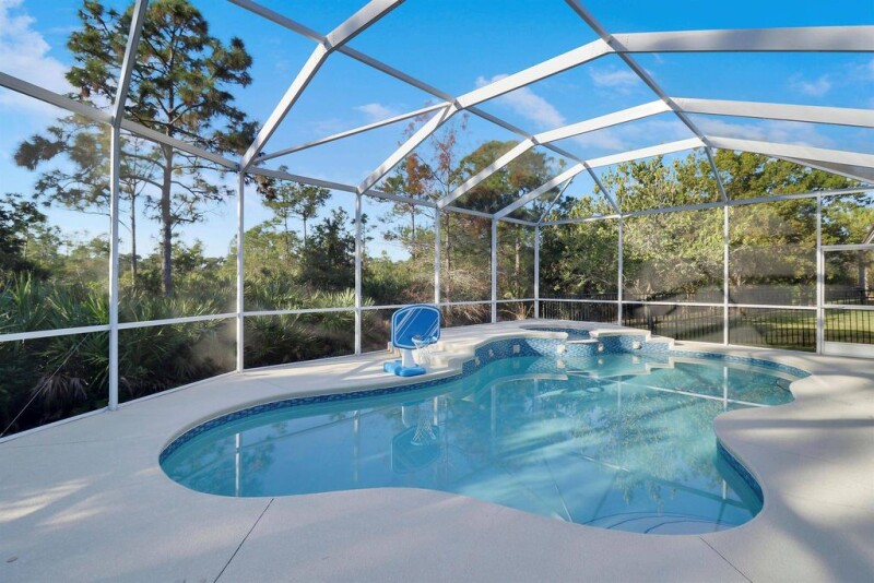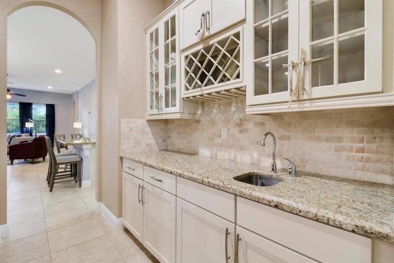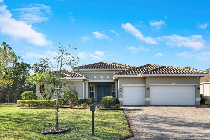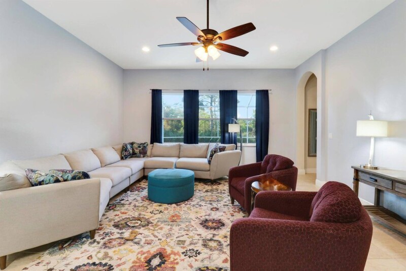 Beautiful 5 BR 3 BA 3 car garage one story home! Spectacular open floorplan with a huge living room adorned with built-in wet bar plus spacious great room and triple split BR plan. The chef's kitchen is a dream with 42-inch cabinets, SS appliances, a pantry, a center island, a breakfast bar, and a cozy nook. Magnificent primary BR suite with two custom walk-in closets and spa-like MBA including walk-in shower, soaking tub, dual vanities and sinks, and a make-up vanity. Resort-style backyard with huge screened-in lanai, summer kitchen, and heated in-ground swimming pool and spa ideal for entertaining and family gatherings! Upgrades and features include: Impact glass and doors, tile, new luxury laminate throughout, crown moldings, and ROI in the kitchen. HOA includes gated entry, resort-.