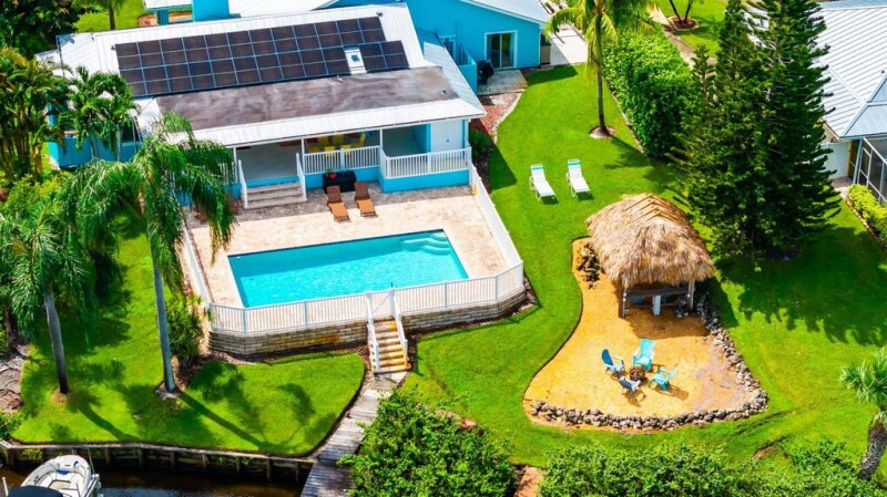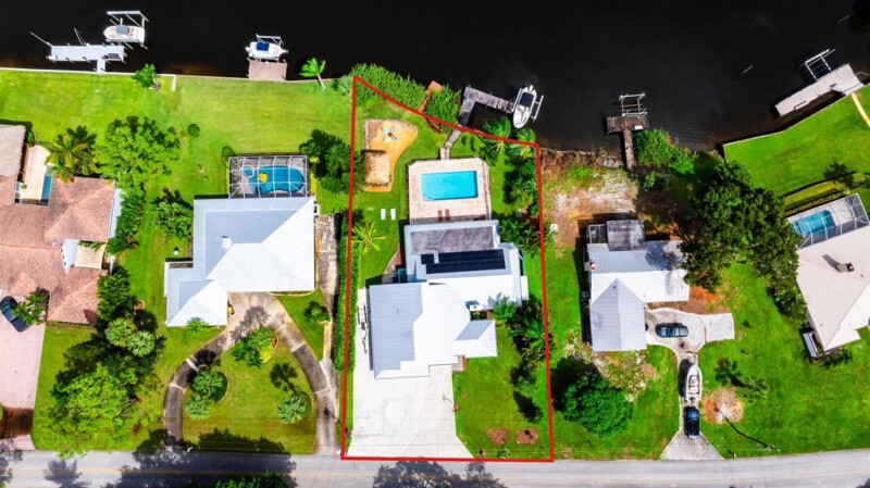 Waterfront Paradise. Bring all toys and offers! Turn-Key & Renovated home offering the ultimate blend of luxury and outdoor adventure. This 4 bed, 4 bath home is a sportsman's paradise with 105 feet of waterfront, a new seawall and 12,000 lb boat lift for easy water access. The outdoor space is an entertainer's dream with a Tiki Hut and a pool complete with a full cabana bath. Inside, you'll find a thoughtfully designed split-bedroom floor plan. The primary bedroom includes additional office space, perfect for working from home. For guests or extra income, the guest suite offers a separate exterior entrance, making it ideal for Airbnb or long-term stays. 2018 metal roof, an RV hook-up pump-out station with 250 amp service.This home is ready for you to enjoy.