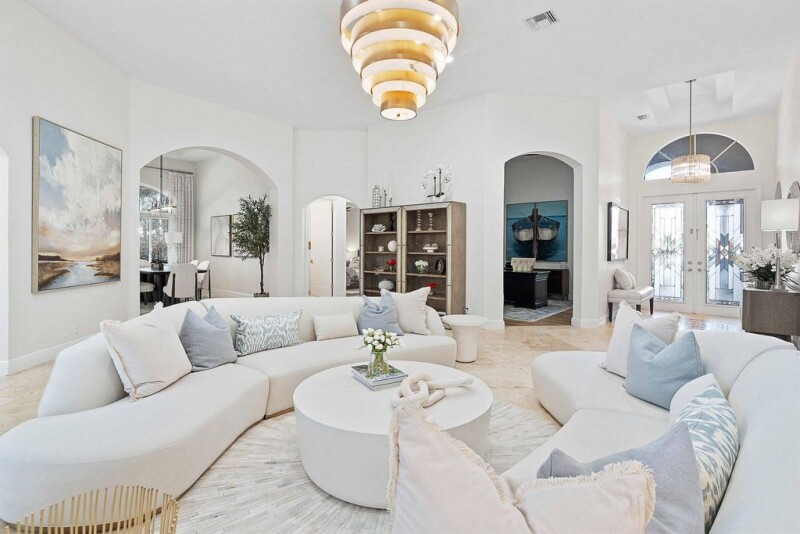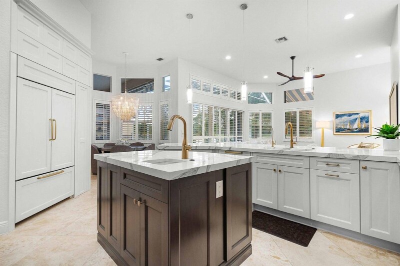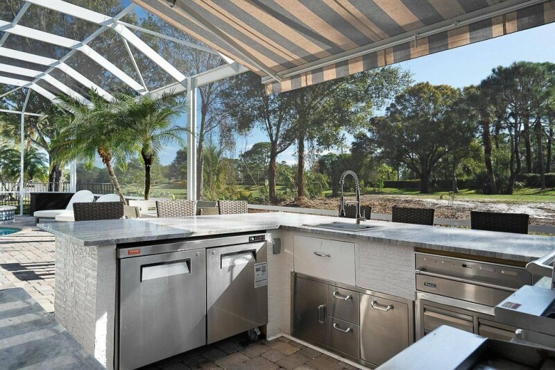 This home offers the perfect Florida lifestyle, where boating, outdoor entertaining, and golfing (non-mandatory) are all at your fingertips. With two private 42' boat slips (included) just a short distance from the house, you'll have easy access to waterfront dining and some of the best fishing spots around. The expansive screened-in patio, featuring a large summer kitchen with wraparound counter and a heated pool & spa, is ideal for enjoying the outdoors year-round. Inside, this move-in-ready home is tastefully updated and features high ceilings throughout. The kitchen is outfitted with top-of-the-line Wolf and Sub-Zero appliances. The primary suite offers a luxurious spa-like retreat. Additional features include a 3-way split bedroom layout, office/den, formal dining, generator.