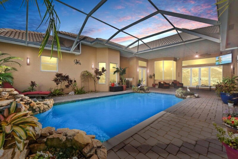 Welcome to this exquisite custom-built courtyard home, perfectly situated on a sprawling 1/2-acre lot in a prime cul-de-sac within the prestigious, guard-gated Cobblestone Country Club. This thoughtfully designed 3-bedroom, 3.5-bathroom home features a beautifully landscaped, screened-in courtyard with a heated saltwater pool, cascading waterfall, and a fully equipped summer kitchen. A separate mother-in-law suite, complete with its own entrance, French doors, and kitchenette, offers a private and flexible space for guests, extended family, or a home office. Inside, discover an expansive open floor plan, high ceilings, a formal living room, dining room with wet bar, and a spacious family room. Elegant details such as Saturnia flooring, crown molding, and tray ceilings add to its refined.