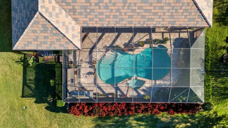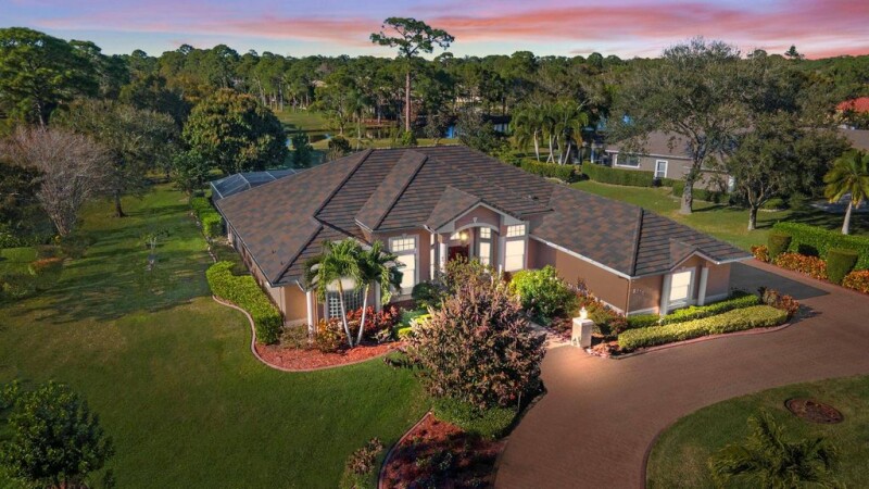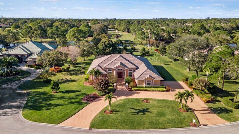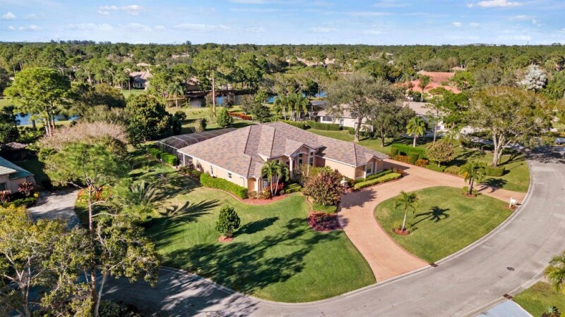 SELLER OFFERING $25,000 AT CLOSE! Looking for something special? Look no further! This custom-built pool home, tucked away in the prestigious PGA Village, offers elegance and privacy on nearly an acre of lush landscaping with mature fruit trees and a tranquil lake backdrop. Boasting over 3,500 sq. ft. of living space, grand coffered ceilings, and nearly 5,000 sq. ft. of total space, it includes 3 ensuite bedrooms, a cabana bath with patio access, a den, and a flex space. The living room features a built-in wall unit with triple pocket sliders for seamless indoor-outdoor living. The gourmet chef's kitchen, recently remodeled, showcases granite counters, a large island, and top of the line Viking appliances, including a double oven, convection oven, hood vent, refrigerator , and wine chille.