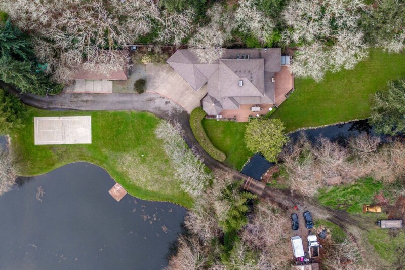 Price Improvement! On Purvis Pond you will find this GATED estate property with manicured grounds. Nearly 4 acres w/a meandering creek that feeds out to Tule Lake. You can simply move into this home with updated & sun filled kitchen; gas cooking; stainless appliances & conversation sized island. All overlooking the POND & outdoor living areas. MAIN FLOOR primary suite w/ generous sized spa like bath w/ sauna-all overlooking your deck; grounds & the sounds of water. Upstairs--two more bedrooms; shared bath. 2ND DETACHED garage makes for perfect storage of all your toys, SPORTS COURT/PICKLE BALL court & even a quaint bridge to the acreage. OPEN SPACE designation allows for discounted taxes. Close to all services; minutes to I5 & JBLM. Unique.