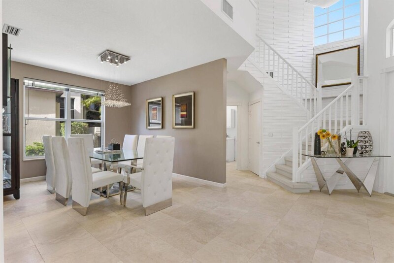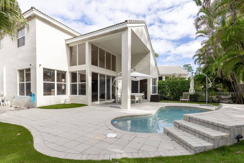 Stunning home in gorgeous Woodfield Country Club has large windows throughout so you can enjoy the natural light & views of the private backyard with pool. Perfect for any decor, this home is sleek and modern with very high ceilings for a large, open feel. First floor primary suite has a view of the backyard. Upstairs features a large loft perfect as a 4th bedroom or office plus 2 bedrooms and 2 full bathrooms. Owner just installed new luxury vinyl flooring on stairs and entire 2nd floor. Unique large driveway fits 4 cars plus park 2 cars in the garage. Woodfield Country Club is a magnificent gated community with incredible clubhouse, restaurants, pool, kid's corner, tennis, golf course, spa, activities and more close to everything in a great Central Boca location near I-95 & turnpike.