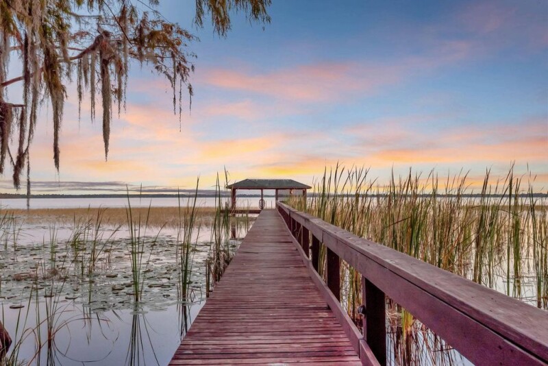 Escape the Orlando hustle and find unmatched value just 30 miles south! This stunning lakefront home offers unparalleled space, serenity, and luxury – something you won't find anywhere near Orlando at this price. Experience how far your money can truly go in this private, picturesque setting. Don't miss out on the opportunity to own a one-of-a-kind retreat! This privately gated, lakefront home sits on 1.2 acres, offering over 200 feet of waterfront and your private beach, providing tranquility and privacy at its finest. The screened boathouse, complete with electricity, water and an outdoor shower, makes every lakeside adventure effortless. Hop on your boat from your private dock and take a short scenic ride to Cherry Pocket for dinner in minutes, an exclusive perk of lakeside living. Enjoy breathtaking sunset views from the wraparound primary suite balcony, take a leisurely visit along the custom pathways or even catch a flight from your own dock, every moment here feels like a getaway. Experience the best of Florida living with the expansive screened lanai that spans the entire length of the first floor, featuring a custom outdoor fireplace ideal for relaxation. Inside, the open-concept first floor is highlighted by another custom fireplace and seamlessly flows onto the lanai through disappearing sliding glass doors, creating a connection between indoor and outdoor spaces. The private guest suite on the first floor offers a sense of comfort and independence for visitors. The detached garage includes an RV hookup, and an additional room used as a yoga studio/gym. The home also features covered parking for six cars. Redesigned and remodeled in 2017, as well as a new roof, air conditioners and whole-home generator added in 2018, along with a new water heater in 2025, this home blends modern efficiency with peace of mind. This property is more than just a home, it's a lifestyle. Don't miss the chance to experience lakefront living at its finest. Schedule your private showing today.