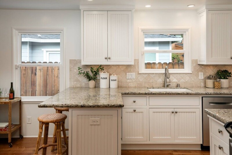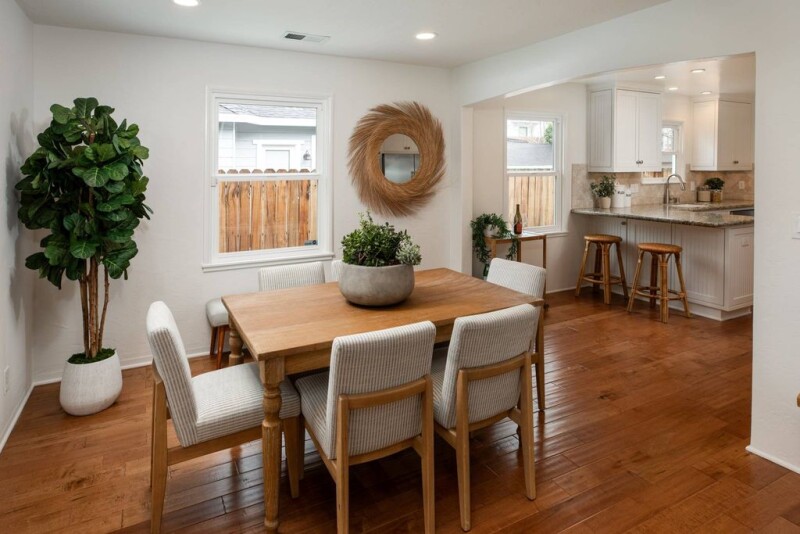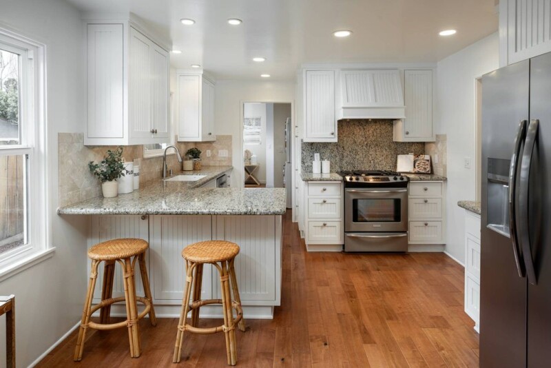 This delightful home has been meticulously renovated and expanded, marrying the existing charm with modern elegance. As you enter the front yard fully fenced for children and pets, you are welcomed by a friendly and inviting covered porch and colorful entry door that leads you to a beautiful home with hardwood flooring and many upgrades throughout. The formal living room is appointed with a stunning stone fireplace surround.The dining room is open to a kitchen endowed with a peninsula for seating, gas range for the authentic chef, and brand-new refrigerator. The primary suite was expanded with a private hallway, walk-in closet, and ensuite bathroom with large walk-in shower. Two remodels were permitted in 2013 and 2016, and the home's systems are all to code. A phenomenal rear yard was expertly designed with a cedar and stone outdoor bar with TV hookup, a canopied bluestone patio for dining with TV hookup, a large lawn, and additional turf area. The rear portion of the detached single car garage has been insulated and finished offering additional BONUS SPACE of over 200 square feet for office, gym, or recreation room. The garage and backyard are situated behind a gate, providing space for secure parking or area to play. In the heart of Silicon Valley, it is close to downtown Sunnyvale, the town center, parks, and Highway 101.