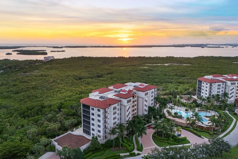 Offered for the first time, this 5th floor mid rise residence offers unprecedented views and spectacular sunsets over Estero Bay. With the opportunity to transfer a golf membership at The Colony Golf & Country Club, you can avoid the long wait list and have immediate access. This residence is partially furnished, offering the convenience of immediately enjoying this updated home. No wait golf membership is available for immediate transfer at the prevailing rate. From the moment you enter this Castella residence, you'll be wowed by the view of Estero Bay and beyond. And just wait until you experience a sunset! Custom built-ins frame the feature wall of the living area and offer the perfect spot for artwork and a desk area. The wide-open plan is ideal for welcoming family and friends and the light and bright kitchen's gorgeous quartz countertops provide a space for everyone to gather. Guests enjoy privacy with a full bath and access to the spacious lanai. The screened lanai is among the largest in the community and offers a tranquil setting for that morning cup of coffee while you listen to birdlife and enjoy amazing sunsets. Storm protection gives you peace of mind, and two covered parking spaces and a large storage unit keep car and belongings safe and secure! Castella offers arguably the best resort-style pool for enjoying the sun or napping in the shade with a comfortable beach entry for the little ones. The Colony Golf & Bay Club offers a private beach island, canoe and kayak, pickleball, bocce, and tennis, all included in your monthly fees, and no additional membership is required. Optional memberships are available at two golf clubs, The Colony & Pelican's Nest, contact membership directors for availability and potential wait lists. The Colony Bay Club is exclusive to residents with spectacular views overlooking Estero Bay. Restaurants and entertainment are five minutes away and SWFL airport is a 20-minute drive.