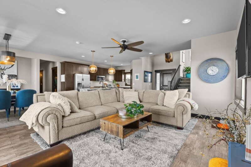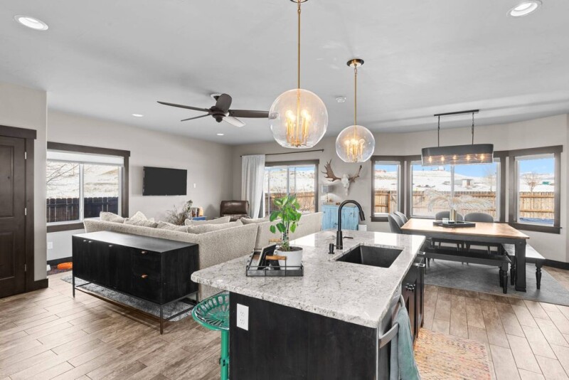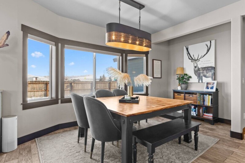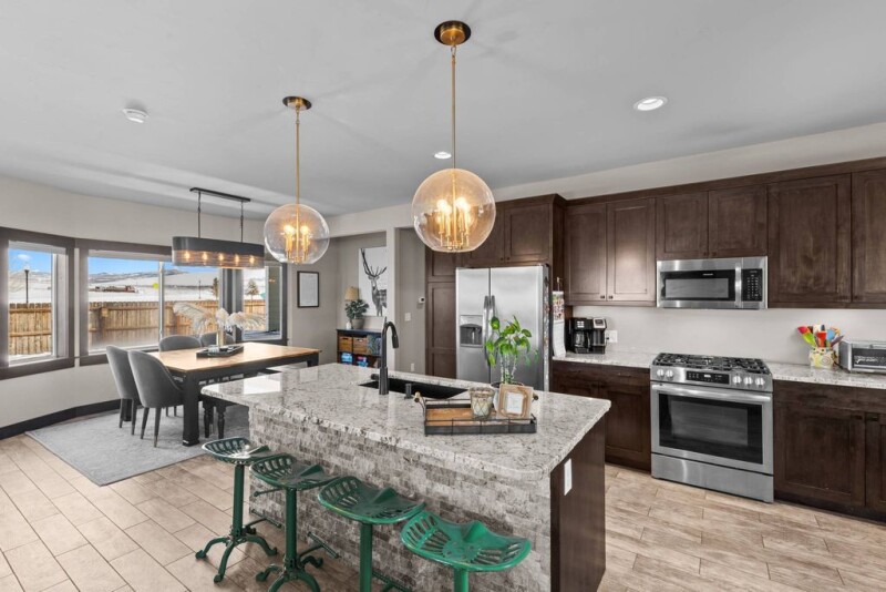 This 4-bedroom, 2.5-bath stylish home in Dry Creek Village offers a highly functional layout with high-end finishes. The main-level primary suite ensures privacy, while the bright, open living and dining areas seamlessly connects to a sleek, modern kitchen with an adjacent full laundry room. Upstairs features three spacious bedrooms, a full bath, and a versatile bonus space complete with modern barn-style doors, ideal for a family room, office, or gym. The home features ample storage throughout and an oversized garage provides additional space for all your needs. Situated on a corner lot, the home boasts stunning sunset views and a spacious patio perfect for entertaining. The fully fenced backyard, enhanced with new landscaping, established trees, and a luxurious hot tub, creates a serene and private outdoor atmosphere. Located on the Steamboat side of Hayden you are just a quick trip to the town of Steamboat and the Yampa Valley Regional Airport. This exceptional home offers the perfect blend of comfort, functionality, and style, making it an ideal retreat for any lifestyle.