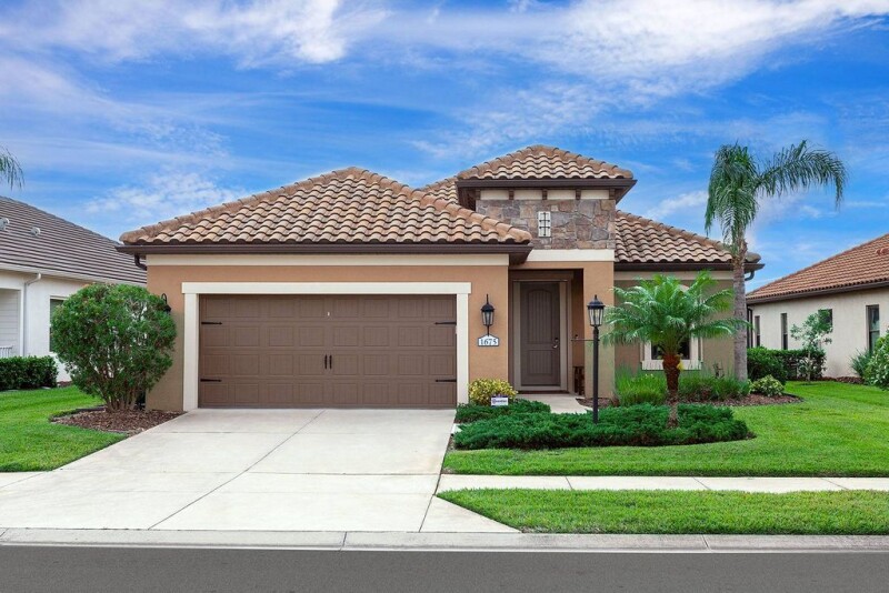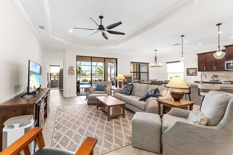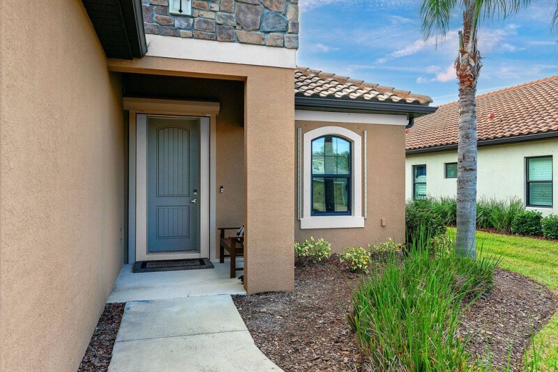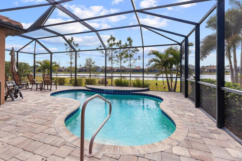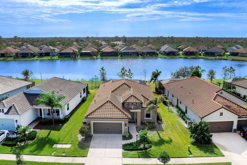 Impeccably maintained and extensively upgraded, this 2019-built, three-bedroom plus den, two-and-a-half bath lakefront home still feels brand new. Broadly appealing for its many conveniences, buyers will enjoy a modern, open floor plan with tray ceilings in the great room and crown molding in the main living area. The home sparkles with tile flooring throughout, neutral walls and an abundance of natural light. In the kitchen, the rich, dark cabinetry and granite countertops paired with stainless steel appliances are a grand statement. A large island with double sink, plenty of countertop space for food preparation, natural gas range with double oven and large walk-in pantry are all added bonuses. Owners will enjoy a spacious suite with beautiful lake views, an en-suite bath with dual sinks and a generous walk-in closet. The split-bedroom floor plan gives both guest bedrooms privacy and easy access to the second bathroom, while the den or office and the additional half bath truly sets this floor plan apart from the rest. Perhaps the most desirable of features is the extended paver lanai with heated pool, perfectly positioned to take advantage of the lake views. Most important are the upgrades that might not be as noticeable but bring the most peace of mind. Whole-home hurricane protection, including roll-down shutters for the covered portion of the lanai, a whole-home Generac natural gas generator, a whole-home surge protector, plus an integrated security system and a location in the X Flood Zone give owners complete serenity. Located in the Grand Palm community with endless resort-style amenities and activities, ranging from a resort-style pool, splash pad and playground to a dog park, pickleball and fishing piers, plus so much more, residents enjoy a myriad of ways to relax or stay active without even leaving the neighborhood. For a full list of what this home has to offer, please be sure to request the features sheet to learn why this home is the perfect choice for the most discerning buyers.