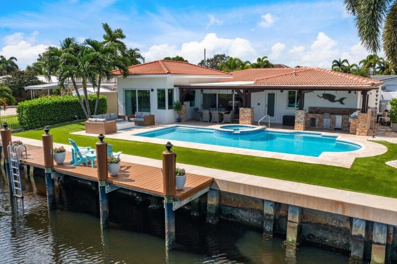 Bring your boat to this turnkey waterfront home on a wide canal with ocean access. A rare find in the neighborhood with 4 large bedrooms and 3 bathrooms. At 2,779 sq. ft., the home is packed with upgrades, including a new seawall, dock, driveway, electrical panel and wiring, all new hurricane windows and doors, new wood-look porcelain tile flooring throughout, a fully updated kitchen with new appliances, and new main house AC. The outdoor space is an entertainer’s dream, a newly resurfaced Diamond-brite saltwater pool, summer kitchen under a covered patio perfect for year-round entertaining, artificial turf, and an east-facing backyard for afternoon shade. The 2-car garage includes custom-built cabinets for ample storage. Conveniently located near the beach, I-95, and Pine Crest School.