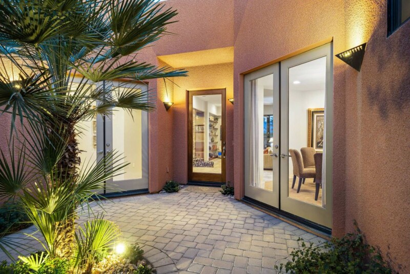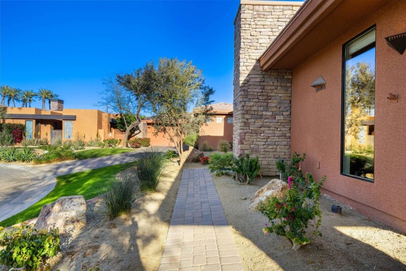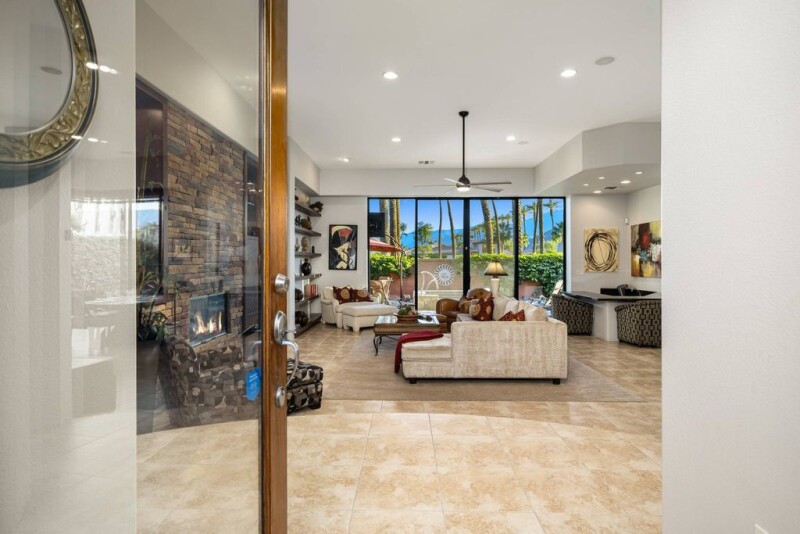 Experience the ultimate in luxury and privacy with this stunning contemporary retreat in the prestigious, award-winning community of Palmilla in La Quinta. This south-facing home is bathed in natural light, creating a bright and airy interior. Step into the private backyard, where a sparkling pool and spa await, surrounded by lush landscaping and 80 beautiful palm trees just beyond the fence and a beautiful Santa Rosa Mountains backdrop. Designed for both comfort and elegance, this residence features two bedrooms plus a private casita, perfect for hosting guests. High ceilings and ten-foot sliding doors seamlessly blend indoor and outdoor living, enhancing the home's spacious feel. The chef's kitchen is equipped with premium Thermador appliances and sleek granite slab countertops. Every bathroom is adorned with luxurious travertine countertops, adding to the home's sophisticated appeal. Move-in ready and fully turnkey, this property comes complete with high-end luxury furnishings, original artwork, and exquisite outdoor living spaces. Enjoy the peace of mind that comes with 24-hour manned security in this exclusive, tranquil community, where seven acres of serene lakes set the stage for an unparalleled lifestyle.
