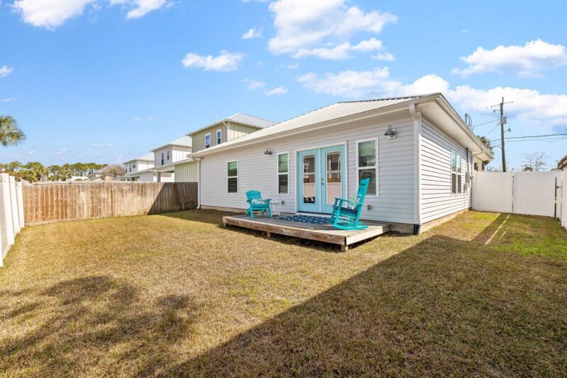 Located at the quieter west end of Panama City Beach, this gently used beach house is fully furnished and ready to welcome part-time or full-time owners. Oozing traditional charm, this coastal gem has a broad driveway for parking and a two-car garage for storing bicycles and beach toys. After all, the beautiful white sandy beach is just a three-minute walk from the door. The covered side entrance opens into a hallway for you to pause before entering the open-concept living room, which has design and decor chosen by Susan Silverthorn Designs. Luxury plank flooring and a soaring tray ceiling provide a sense of abundant light and space. French doors offer additional natural light, opening directly onto the rear deck. The kitchen is larger than average and includes a handy breakfast bar for families to grab a bite to eat or socialize. Soft-close, white, Shaker-style cabinets and stainless steel appliances add a sense of luxury, along with the quartz countertops and glass tile backsplash. Move into the dining area for family meals or relax on the corner sofa and watch TV together after a busy day of shopping, swimming and shelling. Three bedrooms and two bathrooms allow everyone to spread out and enjoy their own private space. The master suite has a neat sliding barn door hiding the ensuite bathroom, which has a double vanity and a shower with floor-to-ceiling tile. Built in closets and drawers surround the wall-mounted TV, providing ample storage in the bedroom. Two additional bedrooms have larger closets. They share a modern family bathroom, which includes a tub and shower combo. A separate laundry room houses the washer and dryer. The enclosed rear yard provides a private space for kids and pets to play safely. Easy to maintain, it has a raised wooden deck for adults to relax and chill. There’s ample space to add a pool later, if required. This well-designed home includes energy-efficient LED lighting throughout, a WiFi-enabled garage door opener, a Smart thermostat and WiFi-enabled irrigation. This golf-cart-friendly neighborhood is just minutes from two large grocery stores, local golf courses and access to Scenic Highway 30A. Camp Helen State Park provides ample recreation nearby, and Rosemary Beach is well known for its boutique shopping and dining experiences.