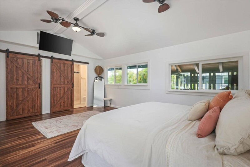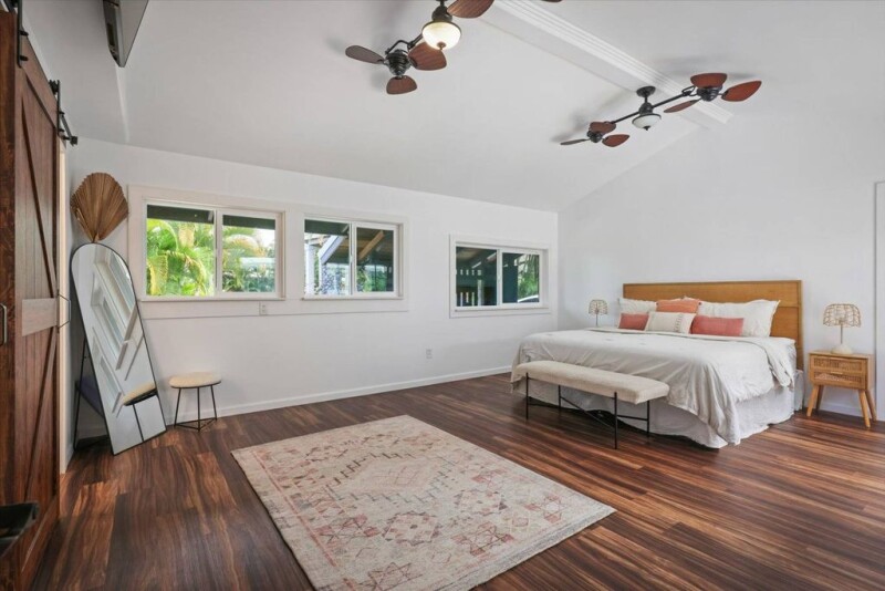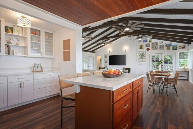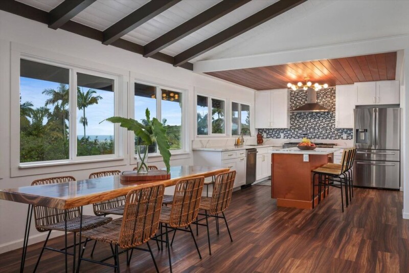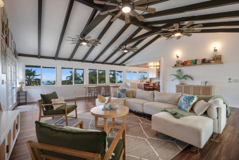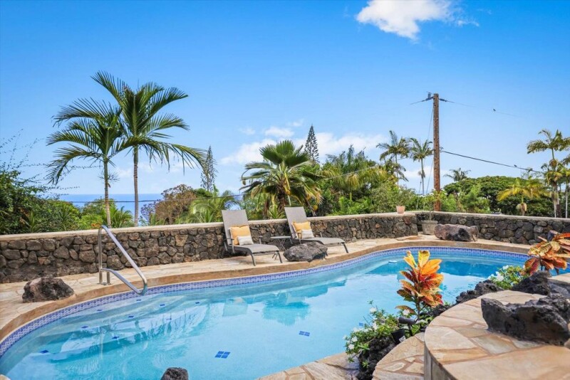 Perched above Kailua-Kona, this 4-bedroom, 4-bathroom home has been completely remodeled in 2022, including a new roof and elegant modern upgrades. The sun-filled 24’x24’ living and dining area boasts expansive ocean-view windows, while the gourmet kitchen features an 8-burner gas stove, double oven, quartz countertops and a large pantry—a dream for any chef. The layout offers ultimate comfort, with a primary suite on one side and a second en-suite and guest room on the other, all featuring walk-in closets and newly tiled bathrooms. Your private paradise includes a pool, hot tub with a soothing waterfall feature, and an outdoor shower, complemented by a wet bar, wine fridge, and BBQ grill. A seat-high rock wall and lush landscaping create a peaceful, resort-like ambiance. The lower-level tastefully decorated "Ohana" is a self-contained 1-bedroom, 1-bath unit with its own kitchen, washer/dryer and dedicated parking—ideal for guests, extended family, or rental income. Escape to the serene terraced backyard, where an elegant water feature and a thoughtfully designed outdoor dining area provide the perfect setting for relaxation and entertaining. Surrounded by beautiful tropical greenery and fruit-bearing trees like avocado and citrus, this tranquil outdoor retreat is ideal for relaxation and gatherings. With its elevated location, stunning views, and peaceful privacy, this exceptional home is a rare find in Kona. Don’t miss your chance to own this island retreat! Downstairs "Ohana" unit is currently being used as a hosted short term rental. The property can be sold fully furnished, ready for immediate enjoyment.