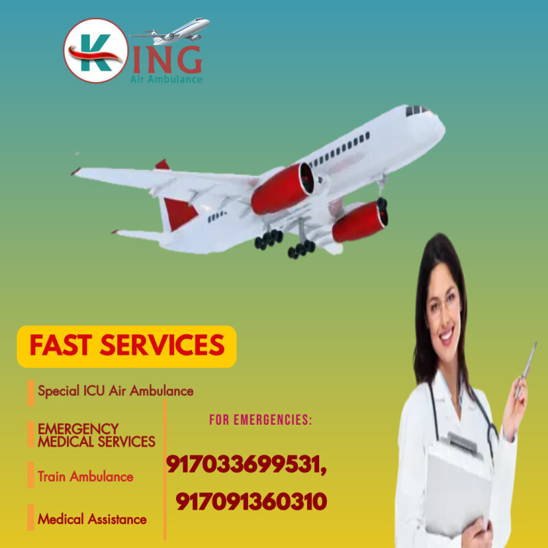 The greatest medical option in Kolkata is the King Air Ambulance, which provides serious patients with round-the-clock medical treatment throughout their transfer. Therefore, get in touch with us right away if you need to move your patient from Kolkata to another place. Additionally, we are providing you with the most dependable and reasonably priced patient transfer Air Ambulance Service in Kolkata, complete with an ICU setup and all necessary medical equipment like oxygen cylinders, ventilators, and nebulizers.