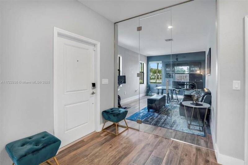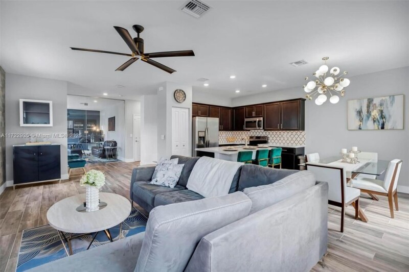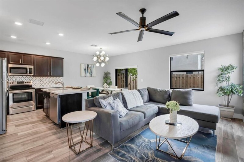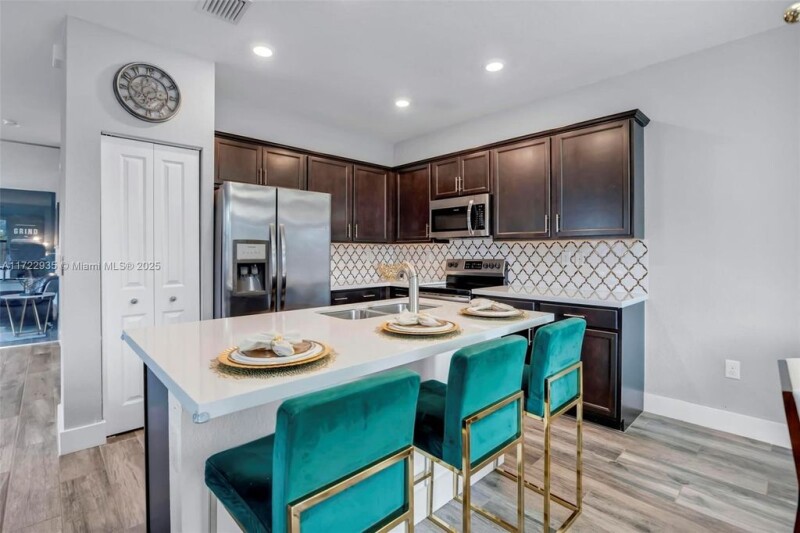 Discover this stunning 4-bed, 3.5-bath home in the sought-after Las Ramblas gated community. Built in 2019, this modern corner unit home offers tons of natural lighting. 4 bedrooms conveniently located upstairs, including a master suite w/ a double vanity & 2 bedrooms sharing a Jack-&-Jill bath. Downstairs, an elegant glass-door office doubles as a potential 5th bedroom. Home features, wood tile flooring, a custom-accented wall, & a bar w/ a wine storage. All luxury fixtures & finishes throughout. The kitchen boasts quartz countertops a large center island, cherry wood cabinets, SS appliances. Enjoy a private backyard, perfect for entertaining, plus a garage. The spacious laundry room adds extra convenience. Located just 10 minutes from Aventura Mall & a short drive to I-95 & major roads.