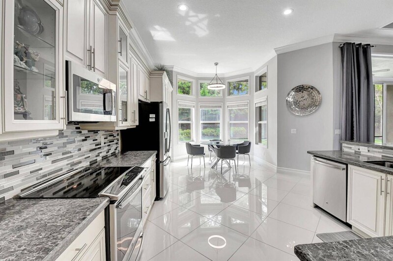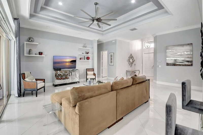 PRICE REDUCTION!! Builders Spec Model, 3 bed,3 full bath, complete impact glass windows & doors, large Chef's kitchen with S/S appliances, a wall of white 42'' cabinets, full pantry,neutral granite counter tops, eat in kitchen area plus bar stools for casual dining and recessed lighting. Two master suites with walk in closets and walk in showers. The third full bath is a tub shower combination. Both the Great room and the two master suites have coffered ceilings. crown molding everywhere. Oversized sliders lead out to a screened porch. Over $76,000 of UPGRADES.The 39,000 sq ft clubhouse offers a grand ballroom, a catering kitchen with classes, a fitness center, a resort style pool with water aerobics, tennis, pickelball, many clubs, many special events and activities. Pet friendly, 55+.