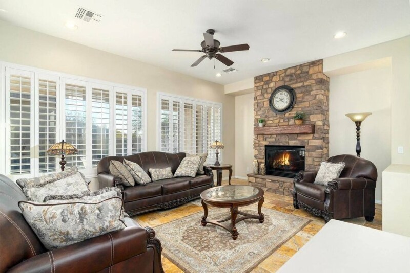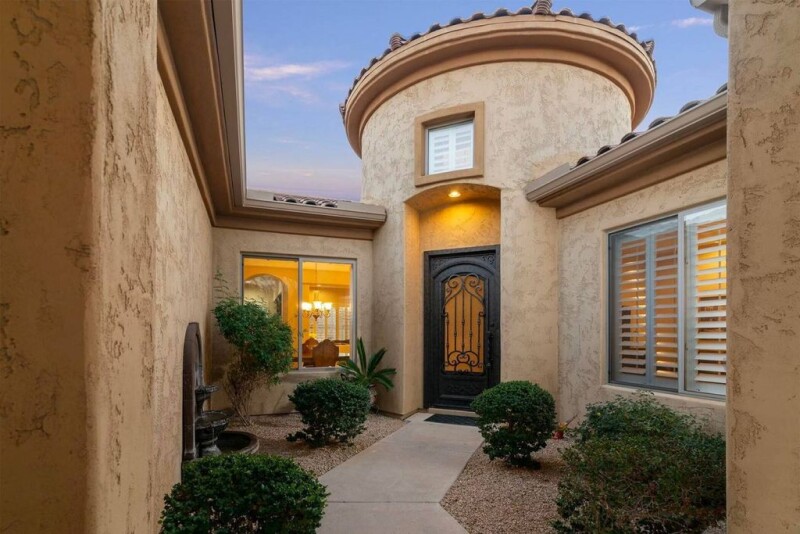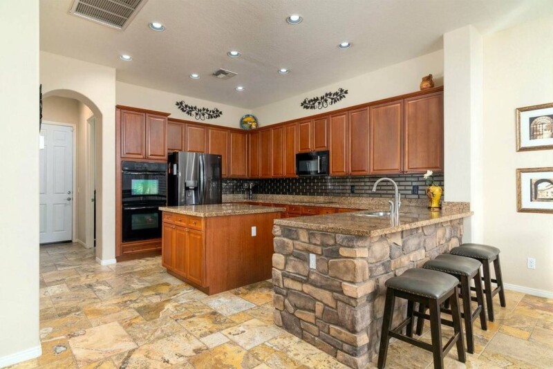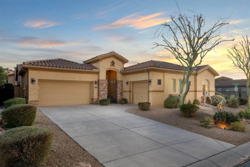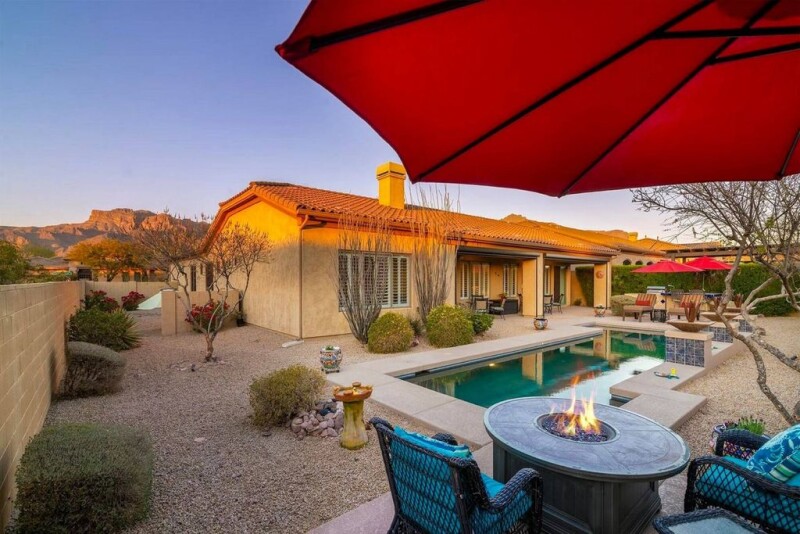 Spacious single story with newer travertine flooring through-out entire house! This floor plan has an open kitchen to living room that goes outside to the covered patio with electric roll down shades, built-in BBQ island that looks out to the gorgeous lap style pebble tec pool with fountains. As you enter through the gated front courtyard you are greeted with a large custom iron & glass front door with a high turret foyer ceiling. One of the three car garages is on one end of the house which leads into a separate living space with two nice size bedrooms, 2 full bathrooms, an office and separate living room from the other side of the house. Both the air conditioners have been replace in 2021, the refrigerator and induction stove have also been updated. Great location in Gold Canyon!.