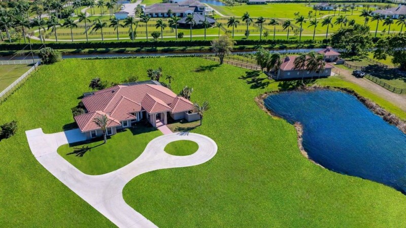 Incredibly Private Farm awaits you on 5.3 acres in gorgeous Palm Beach Point. Behind the exclusive manned gates and tree lined paths, this property sits true hacking distance to show grounds. The 8 stall barn can be converted to 10-12 stalls. There are 6 paddocks, 2 oversized, 5 run-outs, can be reconfigured to 8-10 large paddocks as numerous possibilities await. Grass riding ring is being converted to sand ring now and new perimeter fencing is being installed. Tongue and groove ceiling and beautiful stall fronts are additional options for your dream farm. The beautiful pond is serene and peaceful overlooking the barn, and can be reshaped for a larger arena and area for hot walker is perfect in rear. Nice CBS storage area is next to barn, House and barn each have separate entrances.