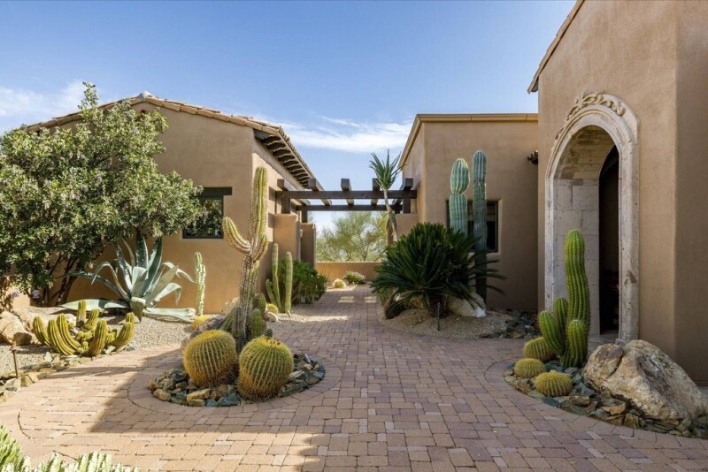 This Spanish-styled home in Desert Mountain's Painted Sky Village checks all the boxes! GOLF Membership available, ZERO steps, and OPEN PLAN. Open 2-5 Saturday, April 5. First time ever on the market. The estate setting is impressively landscaped with lush, mature desert plantings. The great room plan offers expansive views, vaulted ceilings and travertine floors. The split plan provides a primary wing with executive office and a generous guest wing with two king-sized ensuites. All opening onto a resort patio with plentiful covered outdoor living and an expansive sundeck. Firepit deck with sunset views and poolside hearth complete this paradise setting. A separate casita with kitchenette is steps off the entry courtyard. all in fabulous Desert Mountain. Interior photos coming soon!.