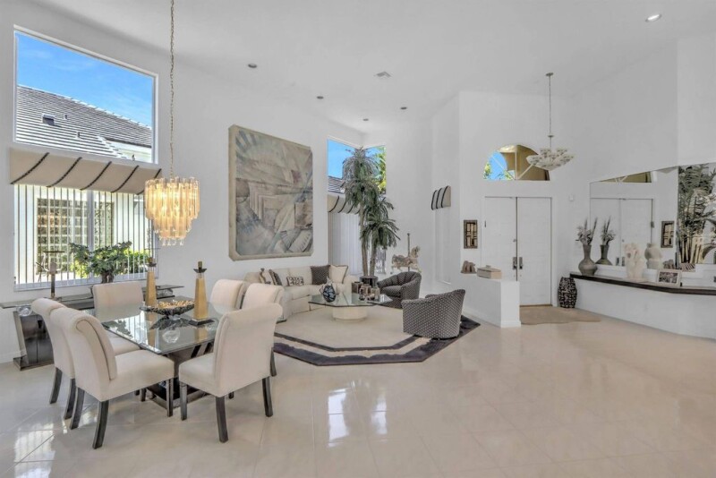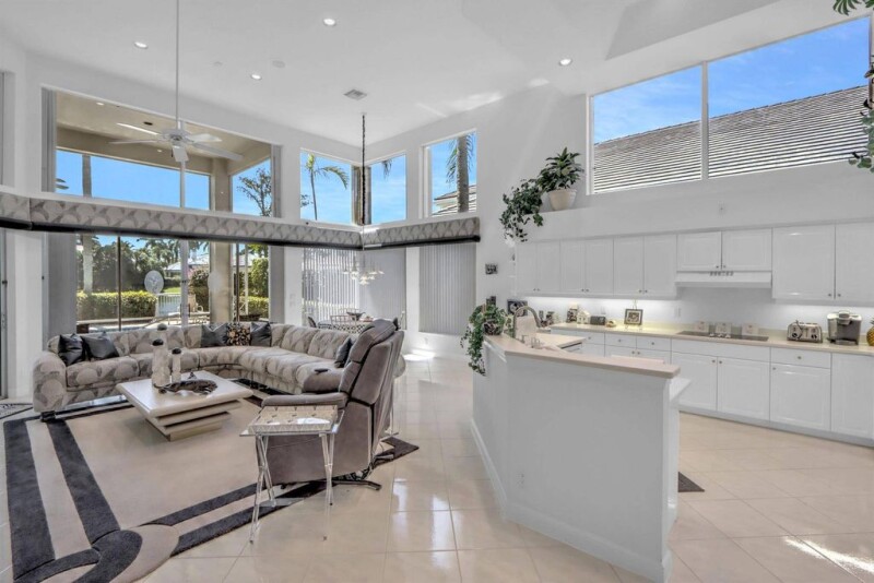 Tranquil lake views and sunlight fill this one-story home of 3 bedrooms plus an office - open & bright featuring volume ceilings with LED high-hat lighting; white neutral tile floors & beige carpeting; and a spacious open kitchen with white 42'' high-gloss cabinetry. The Primary Suite offers his & hers marble bathroom with elevated toilets; the Library has a built-in desk and shelves; the Living Room has a built-in wet bar with refrigerator and the Garage has epoxy flooring. Other features include sold core molded doors; central vacuum & water filtration systems; interior surveillance cameras. The backyard offers a screened patio & an open area with a pool & spa overlooking the lake. Offered furnished or unfurnished at the same price. Roof replaced in 2017.