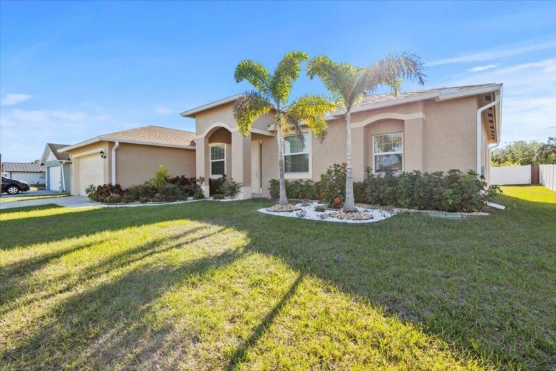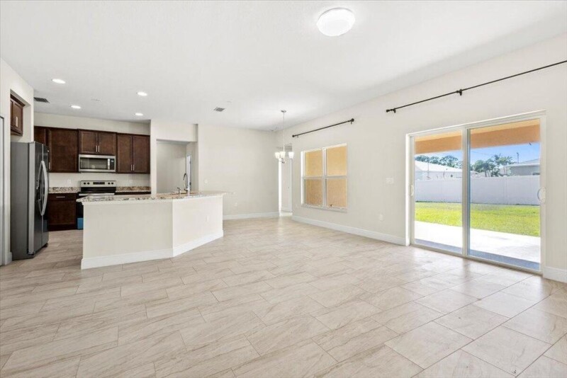 Grand features set this home apart: 2023 roof, full IMPACT windows and doors, and a fully fenced backyard! This stunning 2023-built 4-bedroom, 3-bath home is in pristine condition and move-in ready. Enjoy multiple living spaces, including living, dining, and family rooms, all with a bright, open flow. The chef's kitchen features a large center island, 42'' cabinets, granite countertops, stainless steel appliances, and a cozy breakfast nook. The spacious master suite offers two walk-in closets, dual vanities, a whirlpool spa tub, and a separate shower. Elegant ceramic tile flooring runs throughout. Step outside to a generous covered patio and a beautifully fenced yard! Sitting on a 0.23-acre lot ! No HOA! Quiet Community! Close to shopping, dining and local attractions!.