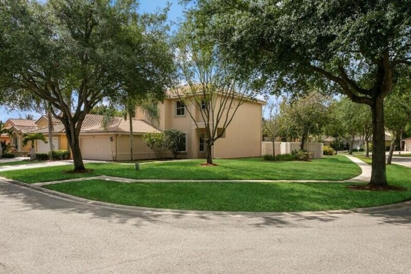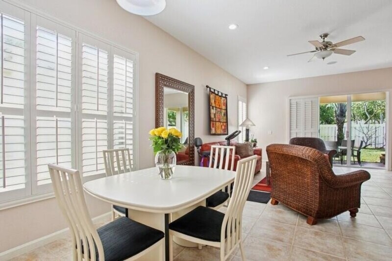 Welcome to this stunning corner unit, two-story home featuring a large fenced-in yard with an extended paver brick patio. The formal DR/LR boast sliders that open to the expansive yard, perfect for entertaining. The gourmet kitchen is a chef's dream with granite countertops & a bright FR with sliders leading to the patio. A beautiful staircase ascends to the reconfigured Heron model, showcasing custom-designed bedrooms. One BR is an ensuite, while the other is unusually spacious, ideal for a workroom or playroom. The large MBR & bath, a walk-in closet, and beautiful lighting from the private greens behind the home. Additional features include central vacuum, plantation shutters, fresh landscaping,& a two-car garage with abundant storage. Conveniently located near shopping & dining.