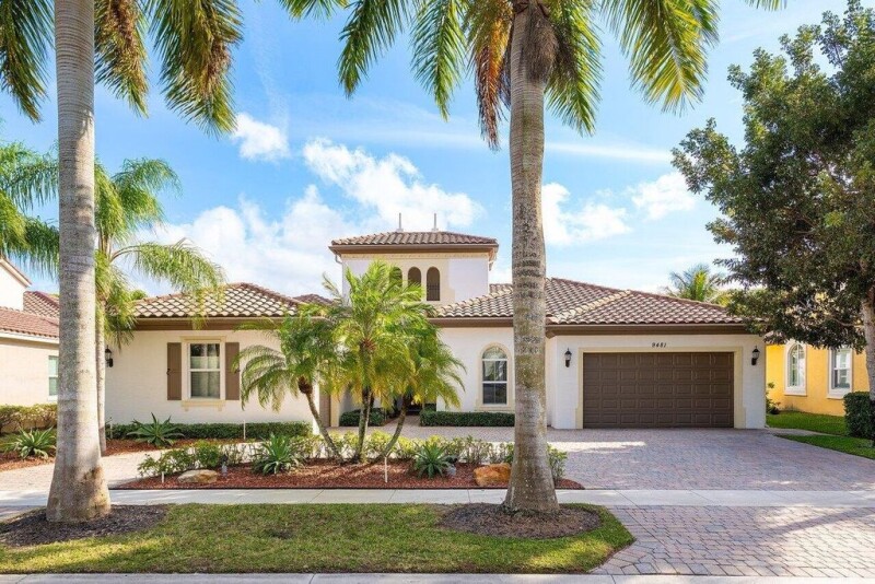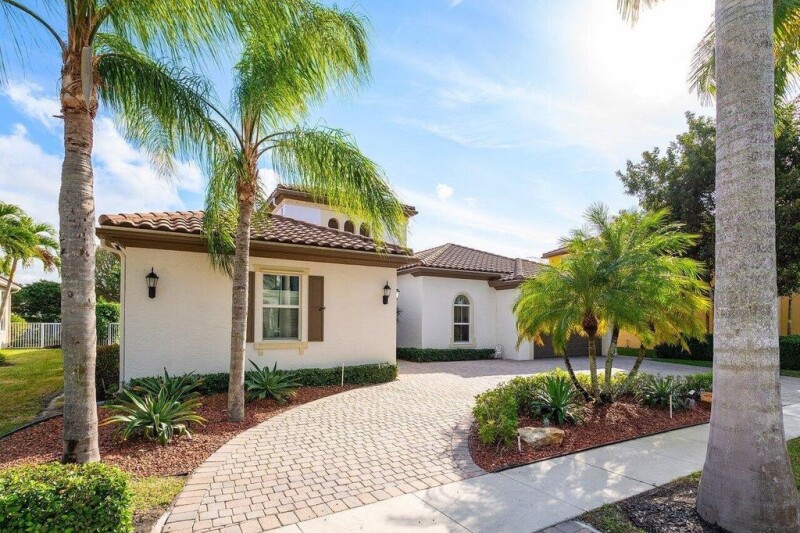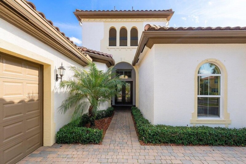 Welcome to this exquisite single-story, 5-bedroom, 4.5-bathroom estate with a 3-car garage, nestled in the highly sought-after community of Olympia. From the moment you arrive, the lush tropical landscaping and oversized circular paver driveway create an impressive entrance, setting the stage for the elegance within. Step inside to find soaring 11-foot ceilings, diagonal tile flooring, upgraded baseboards, and tray ceilings with intricate crown molding, all enhancing the home's luxurious feel. Natural light floods through large plantation-shuttered windows, illuminating the thoughtfully designed spaces. The formal living room features an electric fireplace, recessed LED lighting, and a refined ambiance, perfect for welcoming guests. The adjacent formal dining room, with its.