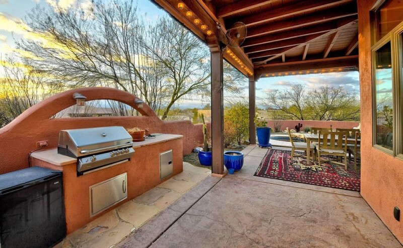 Rare Green Valley Estate with Two Casitas Nestled on nearly an acre of pristine desert land, this extraordinary 3-bedroom, 5-bathroom estate offers an unparalleled blend of luxury, comfort, and entertainment. With TWO exceptional casitas, a dedicated office featuring custom built-ins, a spacious 3-car garage, and breathtaking Santa Rita Mountain views, this home is a sanctuary designed for the most discerning buyer. The main house showcases authentic Mexican Saltillo tile, a split-bedroom layout with en-suite bathrooms, an inviting library, an office/den, a tranquil fireplace, and a renovated kitchen crafted by Linda Robinson Design, named ''Master of the Southwest.'' Every detail blends timeless elegance with modern functionality. One casita serves as a private guest retreat, complete with a mini-fridge, oversized Spanish-tiled shower, and courtyard access. The second casita, transformed into a state-of-the-art home theater, boasts a 120" screen and surround sound perfect for movie nights! The mountain-facing veranda is a standout feature, offering year-round enjoyment with electronic screens that open to welcome the sunshine and breeze - or close to create a cozy, insect-free oasis. Outside, the resort-style pool with a rock waterfall, flagstone pavers, spa, California kitchen, and built-in acoustics creates the ultimate setting for both relaxation and entertaining. Located in the gated Alamos subdivision, this meticulously maintained property is a rare find in Green Valley. Don't miss your chance...Schedule your private tour today!.
