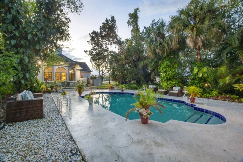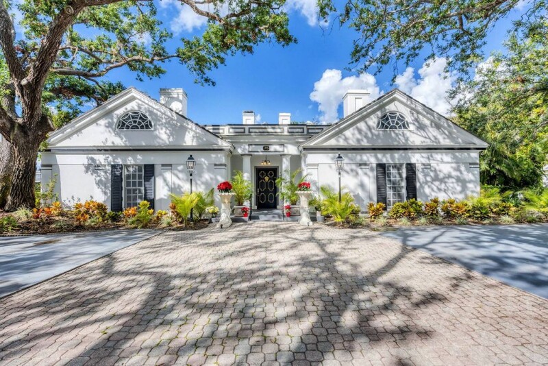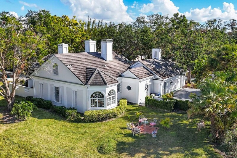 Welcome to 75 Osprey Point, a residence that epitomizes timeless elegance and thoughtful design within the prestigious Oaks Bayside. On two expansive lots totaling over three-quarters of an acre, this architectural estate was originally designed by renowned architect Bo MacEwen, the visionary behind The Oaks iconic clubhouse. A harmonious blend of traditional sophistication and modern updates awaits, with lush Selby-like grounds and serene lake views enhancing the ambiance. The circular drive with pavers leading to a charming tile-front porch invites you to explore the grand interiors. Step through the entrance into a dramatic foyer featuring large-format tile flooring, soaring ceilings with a skylight, intricate crown molding and custom trim details adorning the walls. Lighted art niches provide the ideal setting for showcasing your favorite pieces. The living spaces exude a welcoming grandeur. The family room boasts a custom tray ceiling, a fireplace flanked by built-ins and elegant archways with detailed trim. The stately living room features bay windows framing a cozy seating area with built-in benches, while French doors lead to a secluded patio for moments of quiet retreat. The dining room is equally exquisite, with a tray ceiling, crown molding and sophisticated architectural detailing. The updated eat-in kitchen is a chef's dream, seamlessly blending style and function. Highlights include sleek gray cabinetry, quartz countertops, gold-accented tile backsplash, under-cabinet lighting and premium appliances such as a Sub-Zero cabinet-faced refrigerator, KitchenAid dishwasher, and a Samsung range and microwave. Two custom-organized pantries and an additional Sub-Zero refrigerator provide ample storage. The main house offers three generously appointed guest rooms, each with soaring ceilings, crown molding and custom trim details. Guest baths each feature refined finishes. A separate guest house, equipped with its own HVAC system, offers studio-style accommodations complete with a kitchenette which is ideal for visiting family or friends. Outdoor living is elevated with a gorgeous open-air pool surrounded by lush landscaping, creating a private oasis. The grounds are illuminated with landscape lighting, showcasing the beauty of this estate after sunset. As a resident of Oaks Bayside, you'll enjoy access to a private dock on the Intracoastal Waterway, offering breathtaking views and serene sunsets. The Oaks Club membership is mandatory and provides world-class amenities, including two championship golf courses, 12 Har-Tru tennis courts, a state-of-the-art fitness center, a Junior Olympic heated pool, croquet, pickleball and a variety of dining options. Conveniently near Pine View School, the Legacy Bike Trail, pristine Gulf Coast beaches and downtown Sarasota, this property is a gateway to the best of Florida living. Discover the unparalleled lifestyle and refined elegance of 75 Osprey Point, a home that stands apart in every detail.