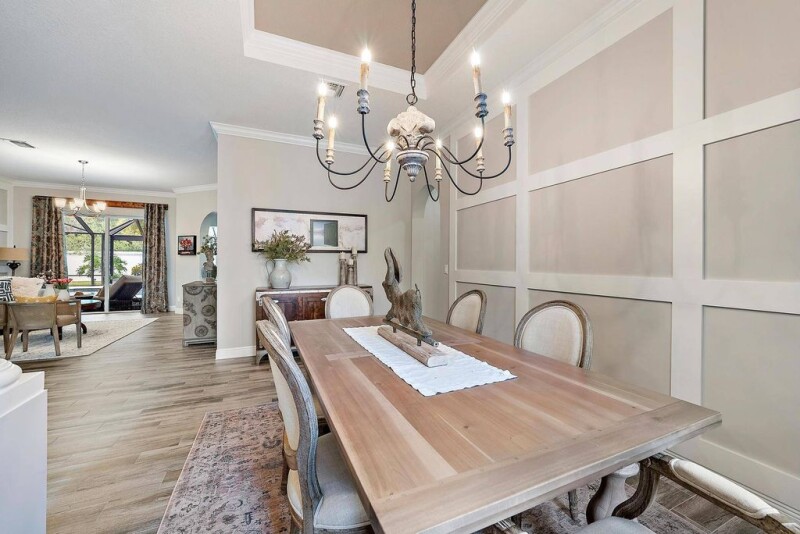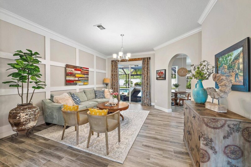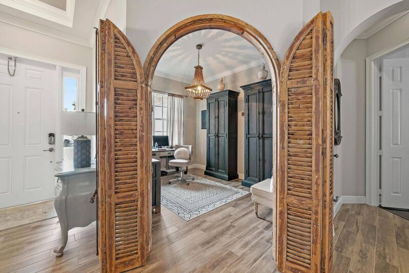 Situated on one of the most private lots in the highly sought-after gated community of Rialto, this beautifully renovated Stockton model home offers an exceptional blend of luxury and comfort. With just over 3,000 square feet of air-conditioned space, this single-story residence features four bedrooms, an office/den, and three full bathrooms. Upon entering, you are greeted by a bright and open living space adorned with elegant wood tile flooring throughout the main areas, while new hardwood flooring enhances the warmth of all bedrooms. The split-bedroom floor plan provides a tranquil retreat, with both the primary and guest suites offering generous space and privacy. Den/office doors were imported from a home in Egypt still with the original hardware adding a nice touch of history.