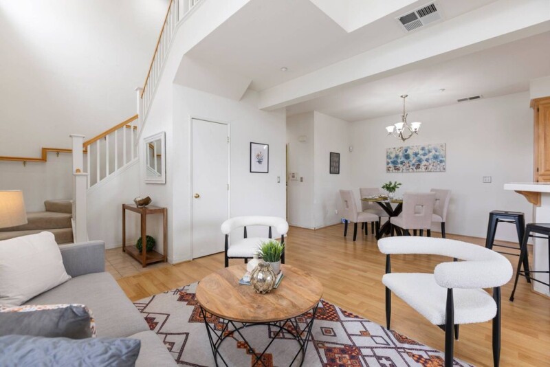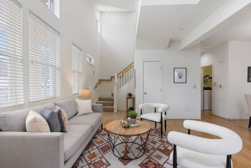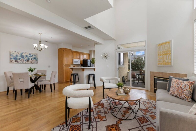 Welcome to this charming home nestled within the tranquil Copper Hill gated community. Offering three spacious bedrooms, two-and-a-half bathrooms, and 1,385 square feet of beautifully designed living space, this residence perfectly blends comfort, style, and convenience. Step inside and be greeted by an inviting open-concept floor plan, where the kitchen, dining area, and living room flow seamlessly together, ideal for entertaining and everyday living. The kitchen is thoughtfully designed with a convenient bar top, generous cabinetry, and direct access to the dining space. The living room with its soaring vaulted ceilings and rich hardwood floors, exudes warmth and sophistication. Step outside to your private patio, the perfect spot to unwind and enjoy the peaceful surroundings. Upstairs, you'll find three beautifully appointed bedrooms, each with ceiling fans for added comfort. The primary suite is a true retreat, offering tall ceilings, dual mirrored closets, and an ensuite bathroom complete with a double vanity, a luxurious tiled glass shower with built-in seating, and additional storage. This home is ready to welcome you!.