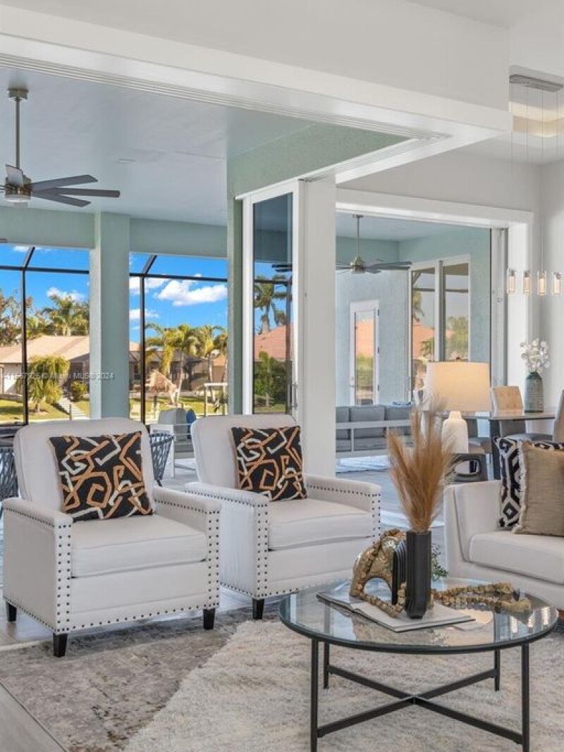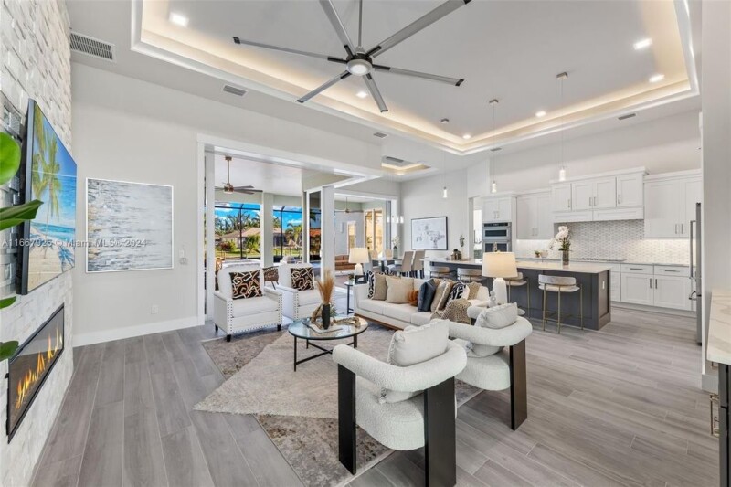 New construction "Grand Cayman 2". Stunning pool and spa home, on a Gulf access canal in Cape Coral, Florida. This 4-bedroom, 4-bathroom home offers the perfect blend of style, and coastal living, making it the ideal for those seeking the ultimate waterfront lifestyle. Clean lines and coastal vibes create curb appeal. The heart of this home is the expansive living area, where 90-degree pocket sliding doors open to seamlessly blend indoor and outdoor living. Imagine hosting gatherings with friends and family as you enjoy breathtaking views of the water. Outside, you'll find a private oasis with a sparkling pool and spa, surrounded by lush landscaping and overlooking the serene waterfront!!.