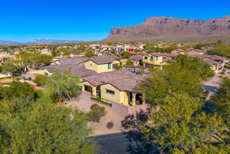 Nestled in the mountains of Gold Canyon, the exclusive golf community of Superstition Mountains offers a perfect blend of natural beauty and luxurious living. Surrounded by the striking Superstition Mountains, this exquisite community features panoramic desert views, lush fairways, and world-class amenities. This beautifully updated 3-bedroom, 3-bathroom home boasts an open floor plan with modern finishes throughout. The spacious layout creates a seamless flow between the living, dining, and kitchen areas, perfect for both everyday living and entertaining. The kitchen features the latest in design, with sleek cabinetry, high-end appliances, and stylish countertops. Step outside to the inviting patio, complete with an automatic sunscreen for comfort during the day and perfect for outdoor dining or lounging. A built-in above ground spa adds a touch of luxury, offering a serene space to unwind and relax under the stars. With all these features and more, this home combines comfort, style, and functionality to offer the ultimate in modern living. Must see this turnkey home. Furnishings available in a separate bill of sale.