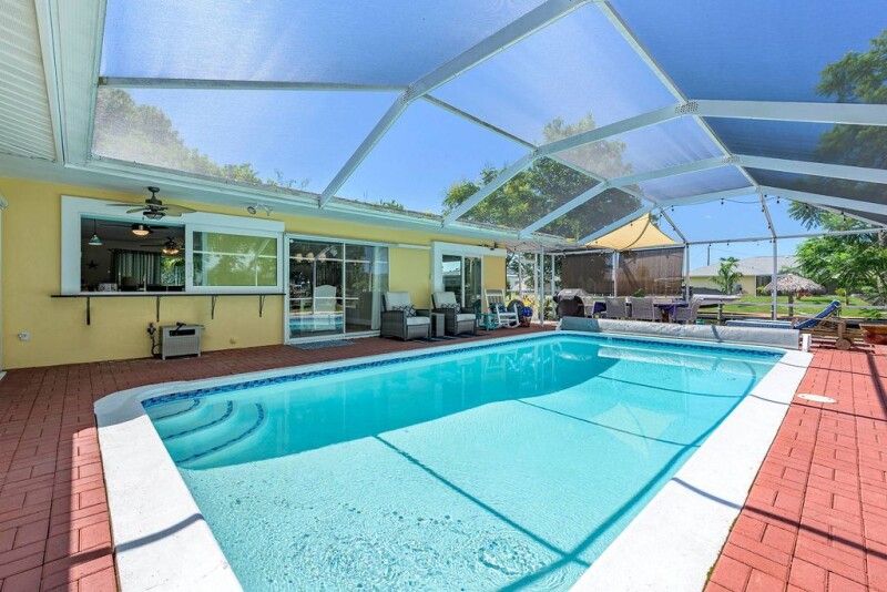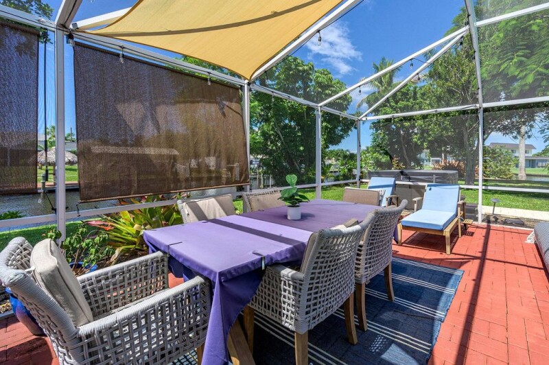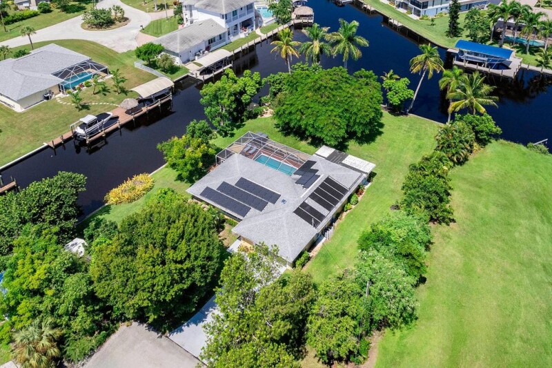 Over half-acre Gulf-access home with 300-plus feet of waterfront near the boathouse! This property is ideal for boating enthusiasts just minutes from the open water. This four-bedroom and three-bath pool home has a Key West charm that you feel as soon as you walk through the front door. One of the guest bedrooms has a Tonal Wall Mount Fitness System. Transferable VRBO listing with over 25 five-star reviews. Total gut and remodel in 2019. Newer kitchen, open floor plan, new floors, new cabinets, sink, etc. $50,000 in impact glass. $45,000 — 11kW photovoltaic solar panel system recently serviced (nearly eliminates your electric bill). New electric panel with Tesla charger installed. Brand-new pool resurfacing (deep end and extra-large pool), brand-new high-end pool pump, extended lanai and lanai renovation, recently serviced boat lift, newer heat pump pool water heater, new hybrid home water heater, resurfaced epoxy garage floor, revamped irrigation system, newly rescreened lanai, newer shed, amazing tropical landscaping with abundant fruit trees, preinstalled home security system, professional landscape lighting. No water intrusion in the living area of the home from Hurricane Ian.