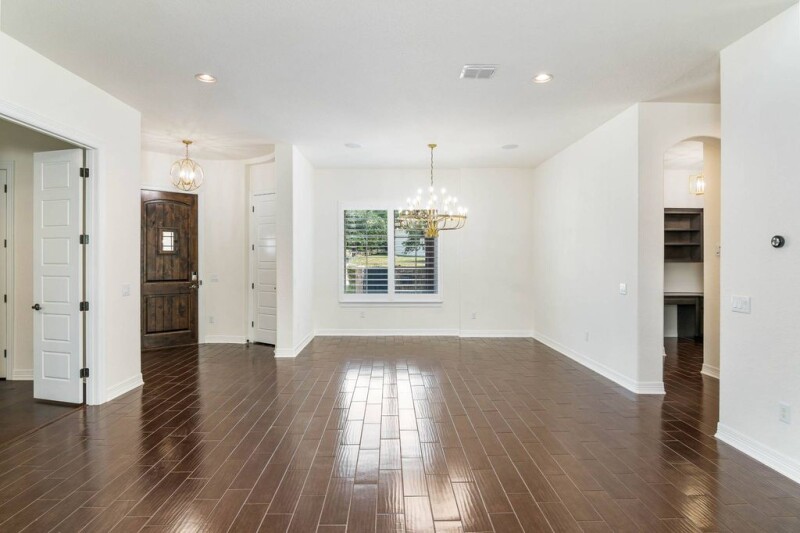 This beautifully designed single-story Sitterle home in the highly sought-after Bluffs at Dominion offers both charm and convenience. Perfect for entertaining, the open floor plan creates a welcoming atmosphere, highlighted by upgraded light fixtures throughout the home, especially in the spacious main living area. The kitchen, breakfast nook, and dining area flow seamlessly within a generous 12-foot space, ideal for gatherings. Natural light floods the home, with an atrium and raised, covered patio on either side. The kitchen features ample countertops, cabinetry, gas cooking, double ovens, and a counter island that seats multiple guests, making it a central hub for hosting. The primary suite is a private retreat, set apart from the other bedrooms for added privacy. It boasts a spa-like bathroom and a large walk-in closet. On the opposite side of the home, two additional bedrooms share a full bath, along with a nearby half bath. A fourth bedroom near the front can easily double as an office, game room, or flex space. Ample storage is found in the finished attic space above. An additional office/organization area is tucked behind the kitchen, complete with built-in shelving and a countertop. The home features solid surface flooring throughout-tile in the living and wet areas, and hand-scraped wood in the bedrooms, with no carpet. Other highlights include wood shutters, smart home security and automation systems with CCTV cameras, and a spacious side-entry garage equipped with an EV charger and custom epoxy-finished floors. The raised backyard patio is perfect for enjoying your morning coffee or an evening drink.