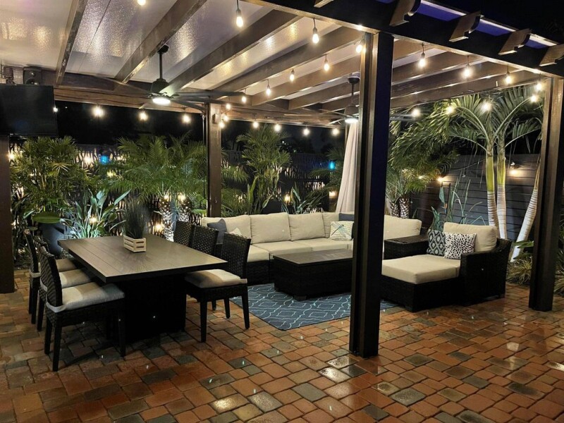 Nestled in the highly sought-after neighborhood of The Cove, this charming 4-bedroom, 2-bathroom home offers an inviting layout that seamlessly blends comfort with modern amenities. This cash producing AirBnb has a 5 star rating and is a staple for returning guests. One of the standout features of this home is the private oasis backyard which sets it apart from others in the area. With a heated salt water pool, an 8 person hot tub, hurricane rated gazebo, bar and a daybed you'll be ready to live the South Florida lifestyle all year round. The mature landscaping throughout really makes this home feel like a tropical retreat. The interior has 4 bedrooms, one of which is being used a gym and two renovated bathrooms. The kitchen offers black SS appliances, quartz countertops and new.