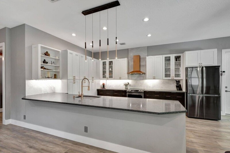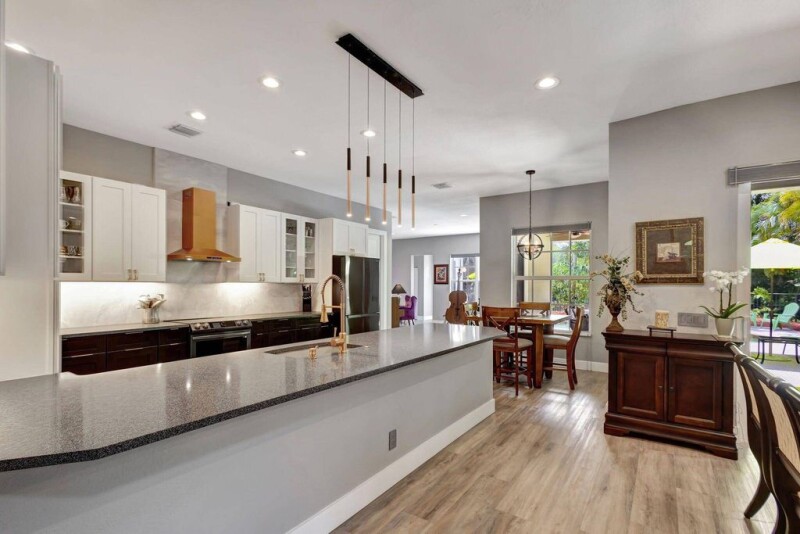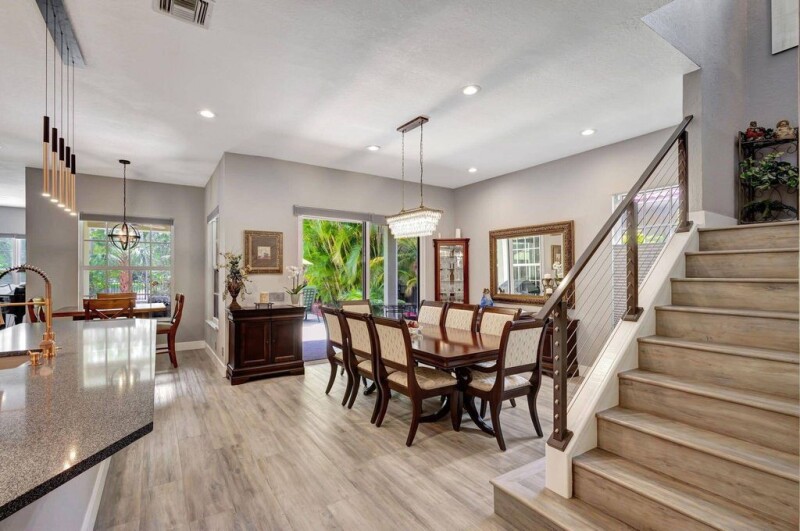Don't Miss Out on this renovated 4BR/4BA plus den home with lake views in the popular & sought after community of Paseos!! Hurricane impact windows and doors throughout. The Kitchen is completely remodeled w/ brand new cabinets,, counter tops & all new appliances (Refrigerator, electric range, oven with air fryer, drawer style microwave & dishwasher). All 4 full bathrooms have been remodeled as well. Brand new water resistant vinyl wood flooring throughout. Two high-efficiency A/C units with new air ducts upstairs and recently cleaned & coated downstairs duct work. The first floor has 1 guest bedroom, 2 full bathrooms & an office/den with custom cabinets. This house sits on an oversized landscaped lake lot that is fully fenced with a salt water pool with a new chlorinator and pool pump.