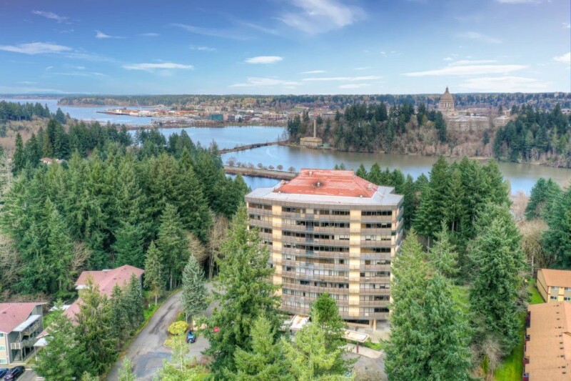 Views of the Capitol, Capitol Lake and downtown from this 7th floor corner unit. This well-kept 2-bedroom, 1½ bathroom condo is a great opportunity for low maintenance and convenient living on the Westside of Olympia. Open living space, kitchen with breakfast bar and lots of cabinet space. Primary features large closet, walk through full bath, and secondary room currently set up as an office. Capitol Lake Towers is a secure building and with parking garage and EV charging stations, media room and an exercise room with sauna for the residents. Located near medical facilities, shopping, parks, downtown amenities and freeway access.